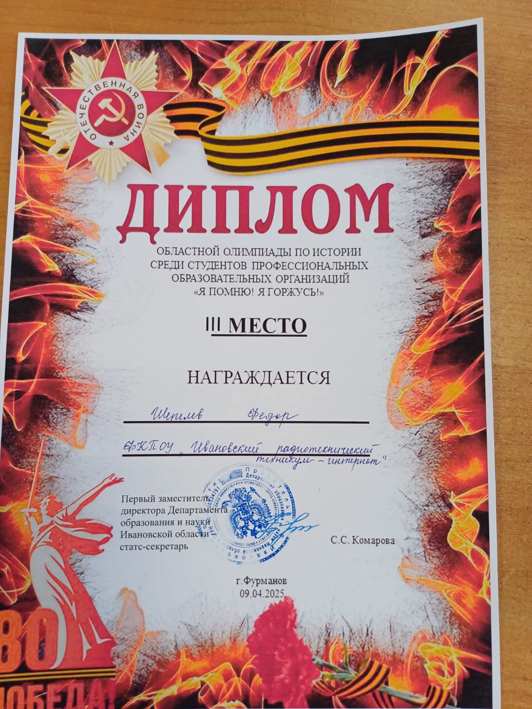 Шепелев Федор Алексеевич (гр. 3.77) 9 апреля 2025 года принял участие в областной Олимпиаде по истории «Я помню! Я горжусь!», которая организована по инициативе отдела профессионального образования Департамента образования и науки Ивановской области совместно с ОГБПОУ Фурмановским техническим колледжем.