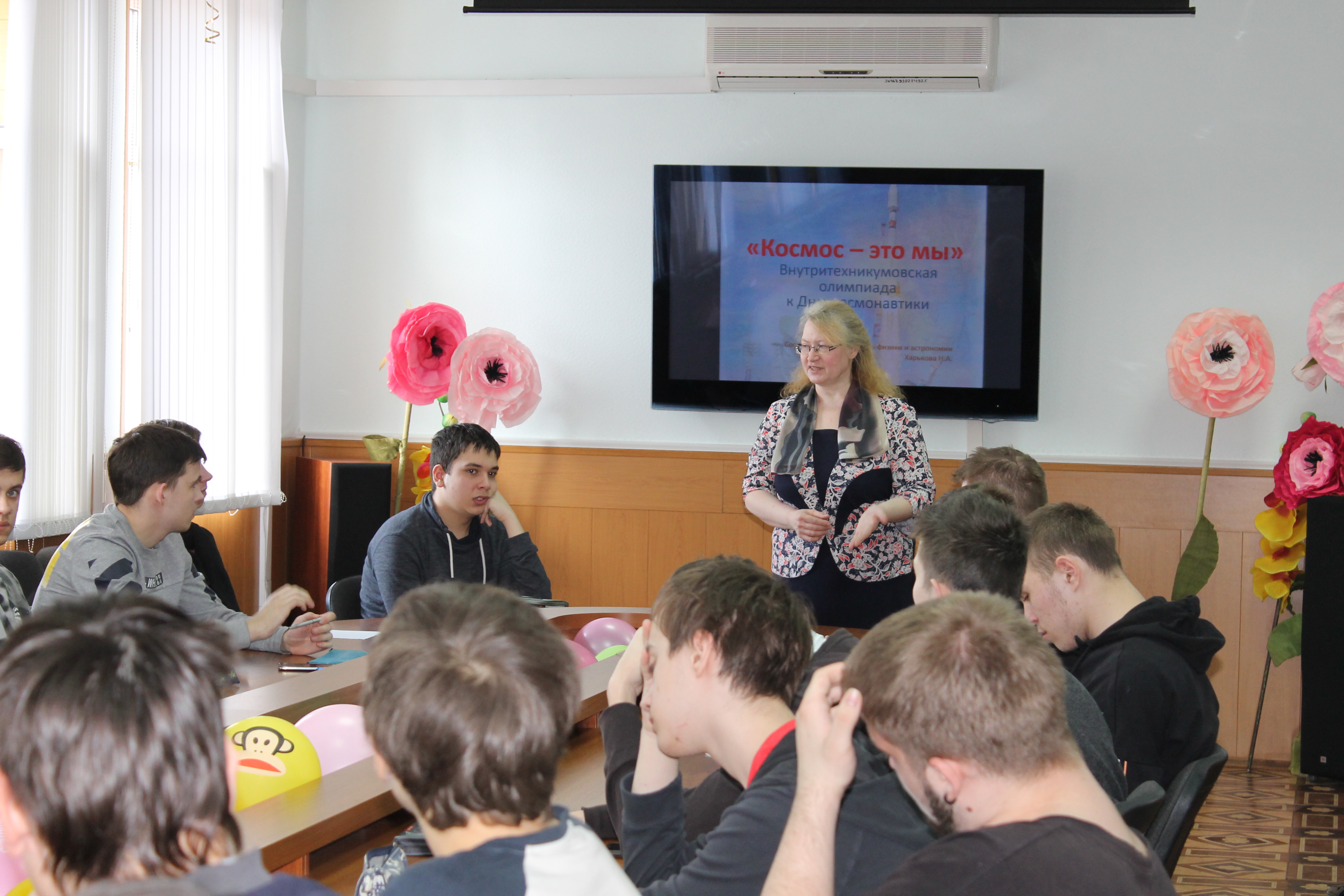К Дню космонавтики для обучающихся первого курса 12 апреля 2022 года в учебном корпусе техникума была организована олимпиада «Космос- это мы», которую провела преподаватель физики Харькова Наталья Александровна. В ходе олимпиады командам предстояло ответить на 15 вопросов, раскрывающих основную суть знаменательной даты Дня космонавтики. В результате упорной борьбы зачёт по группам распределился следующим образом: 1 место – студенты группы 1.74, 2 место – студенты группы 1.75, 3 место – студенты группы 1.76. В личном зачёте наибольшее количество баллов получили: 1 место – Сквознякова Анастасия, гр. 1.75 (22 балла), 2 место – Аршин Иван, гр.1.74 (18 баллов), 3 место – Мещеряков Евгений, гр. 1.74 (14 баллов), Баринов Александр, гр. 1.74 (14 баллов). Значимый вклад в победу своей команды внесли следующие студенты:  Степной Кирилл (8 баллов),  Григорьева Мария (6 баллов),  Бандяев Иван (6 баллов). Всем участникам олимпиады «Космос ─ это мы» были вручены сертификаты, а ее победителям и призерам ─ дипломы. Молодцы! Успехов во всех видах деятельности.