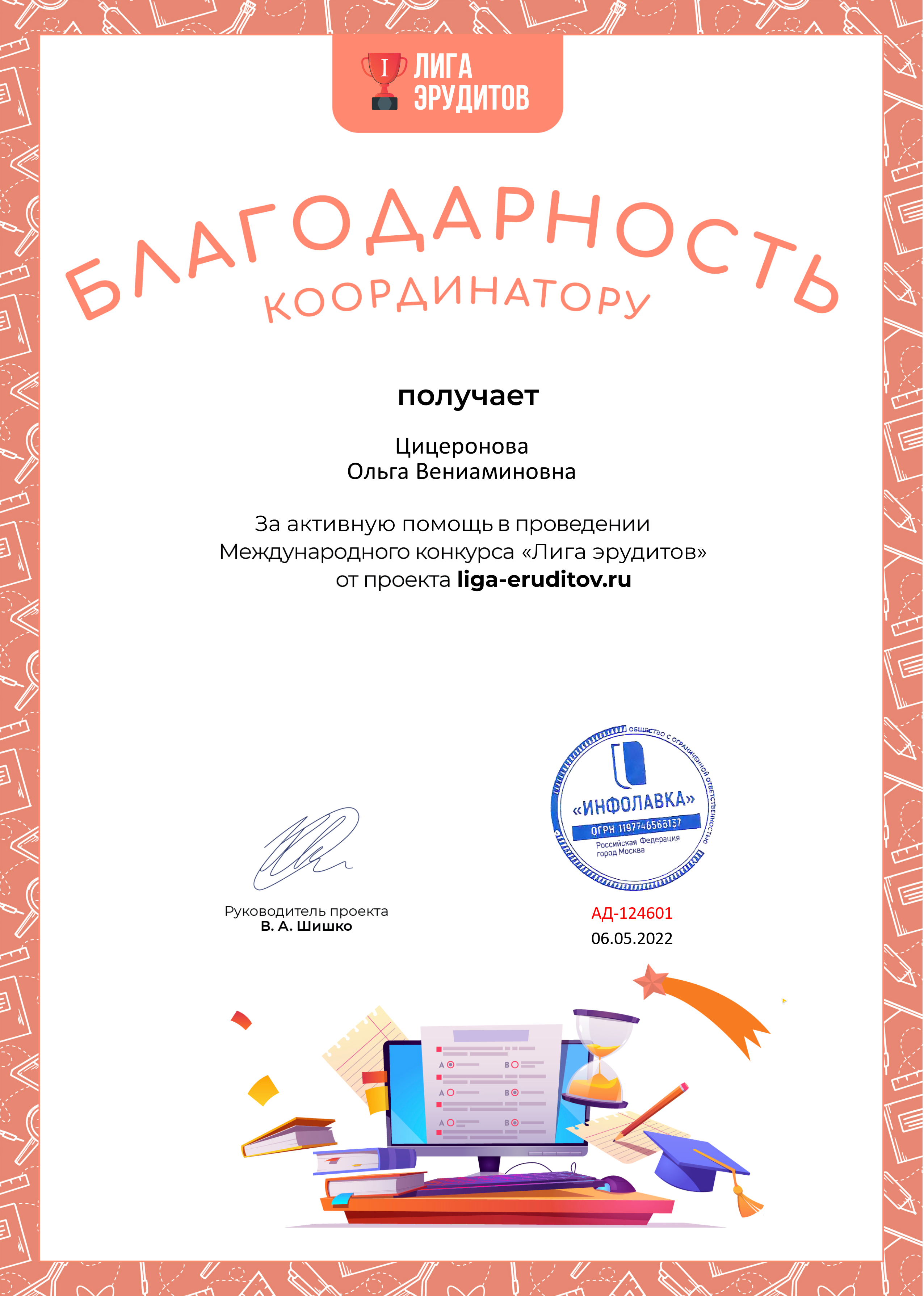 Преподаватель Цицеронова О.В. получила благодарность от организаторов мероприятия за активную помощь в проведении Международного конкурса «Лига эрудитов» как координатор участия студенток в дистанционной олимпиаде.