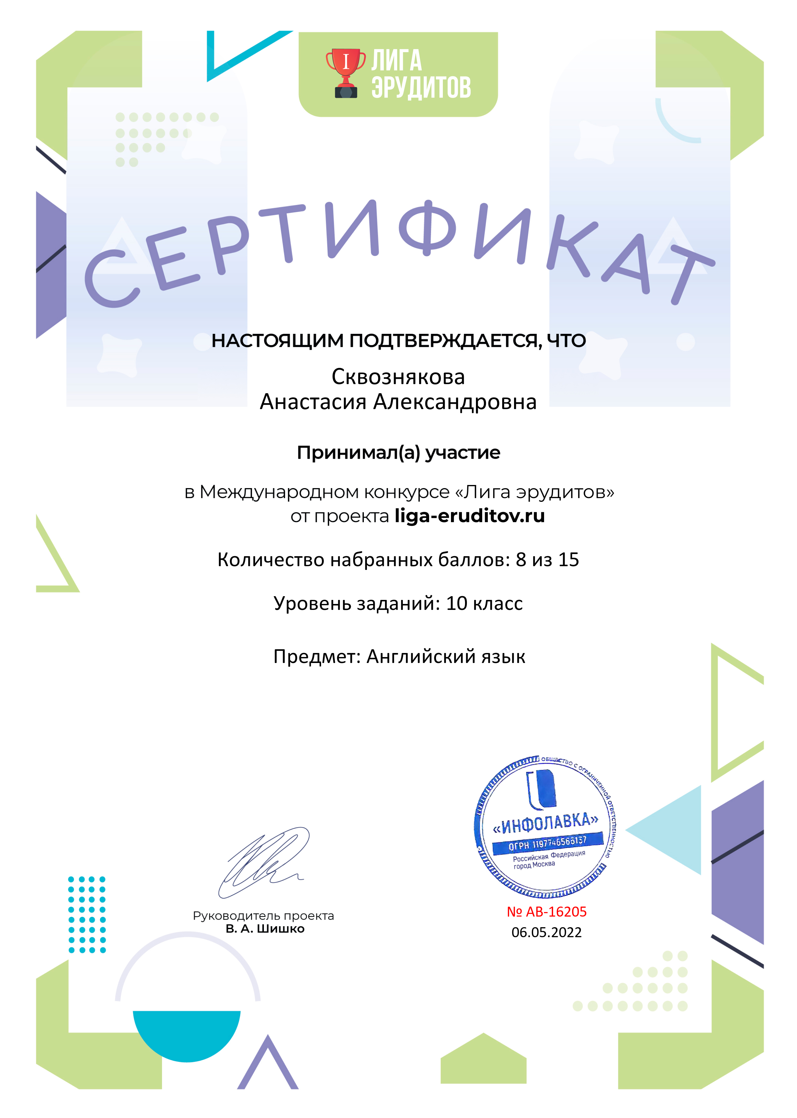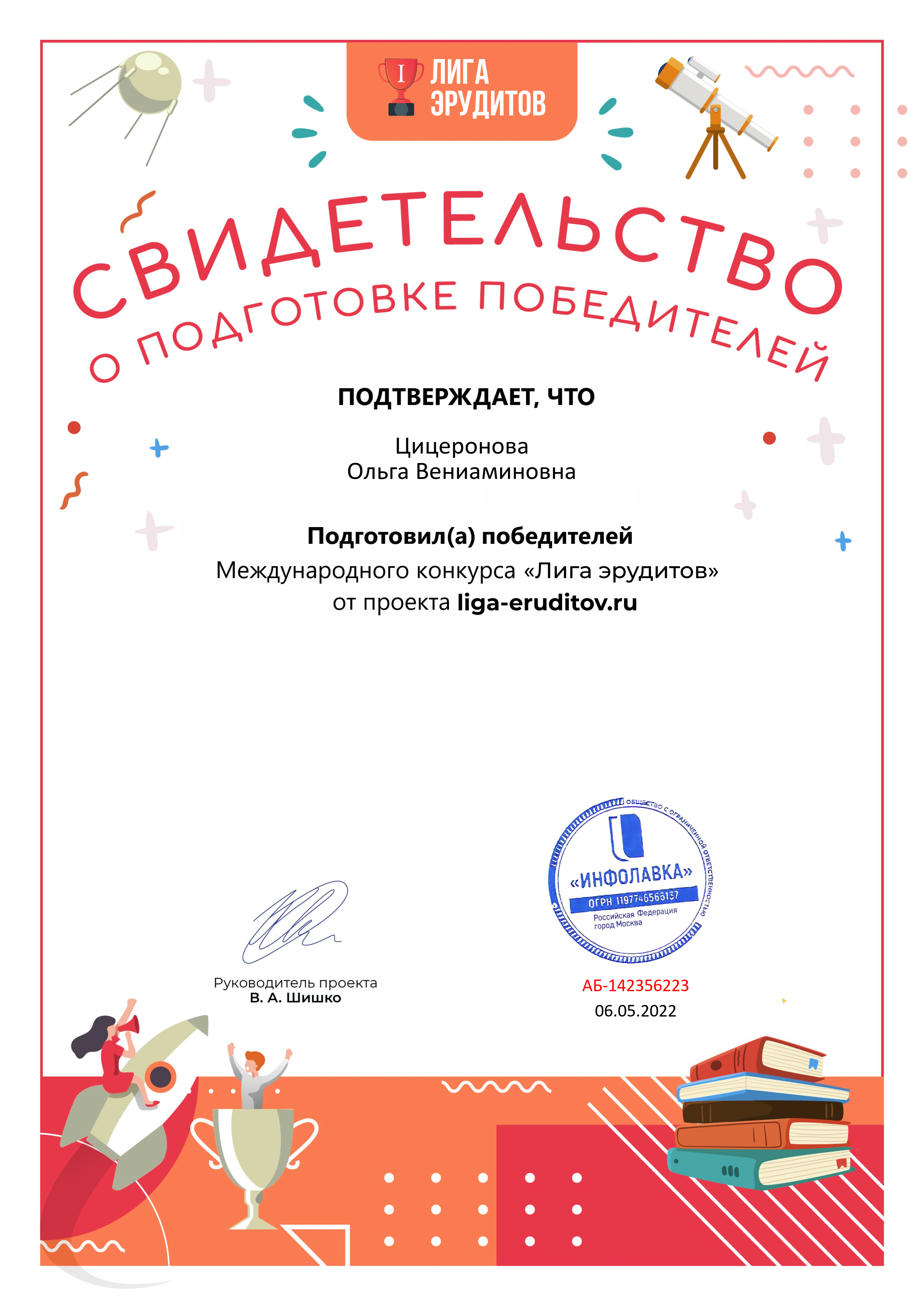 Студенты первого курса группы 1.75 под руководством куратора и преподавателя Цицероновой Ольги Вениаминовны 6 мая приняли участие в Международном конкурсе «Лига эрудитов» от проекта Liga-eruditov.ru в дистанционной олимпиаде по учебной дисциплине «Английский язык».