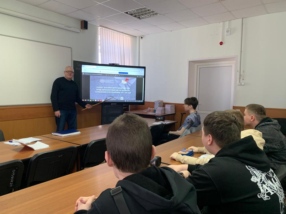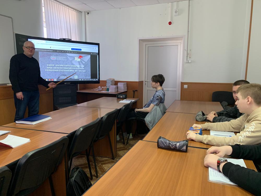 17 апреля в группах первого курса преподаватель истории Константин Евгеньевич Коломиец провел тематический час, приуроченный ко Дню памяти жертв геноцида советского народа нацистами и их пособниками в годы Великой Отечественной войны 1941–1945 гг.