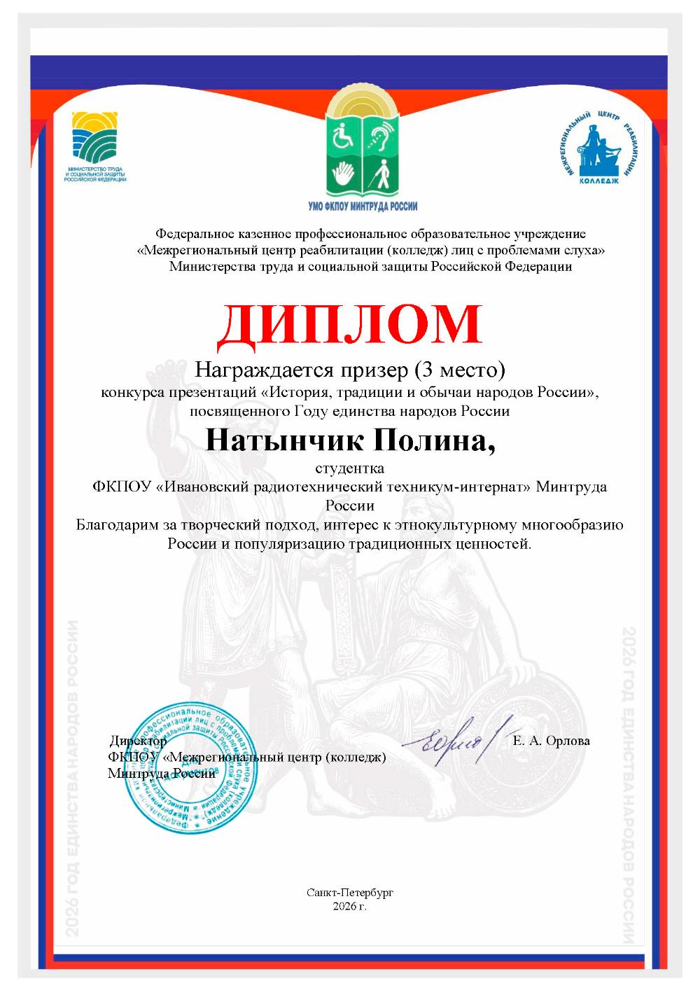 Подведены итоги конкурса презентаций «История, традиции и обычаи народов России», посвящённого Году единства народов России, который проводился согласно плану работы секции по реализации среднего общего образования в пределах образовательной программы СПО учебно-методического объединения Минтруда России на 2026 год.