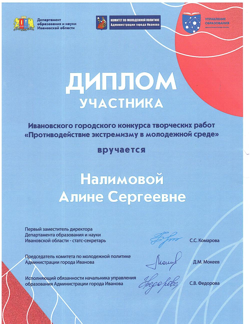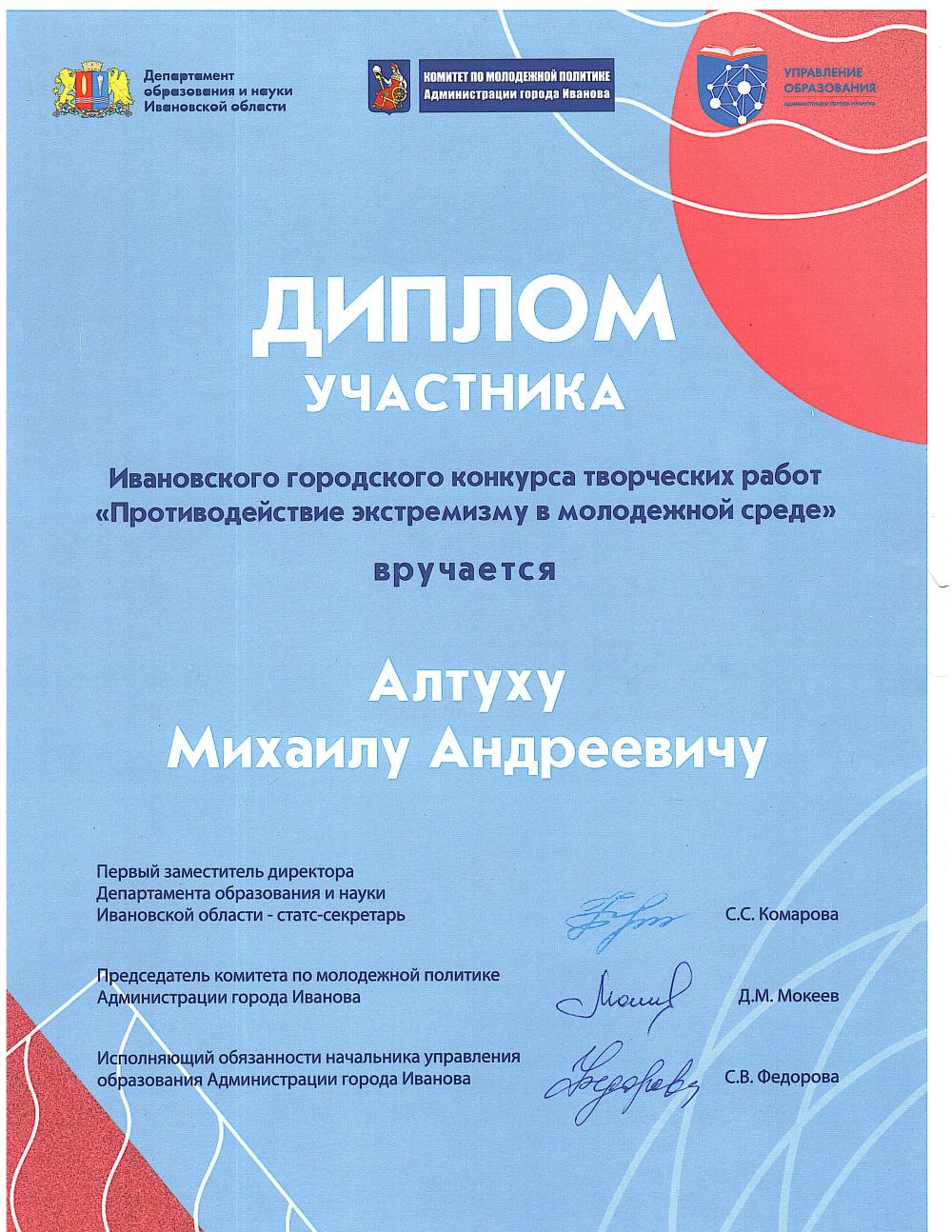 Итоги традиционного Ивановского городского конкурса творческих работ на тему «Противодействие экстремизму в молодежной среде» подвели в мэрии 16 апреля. Впервые конкурс был проведен в 2021 году. Его целью стало привлечение внимания молодежи к проблеме экстремизма.