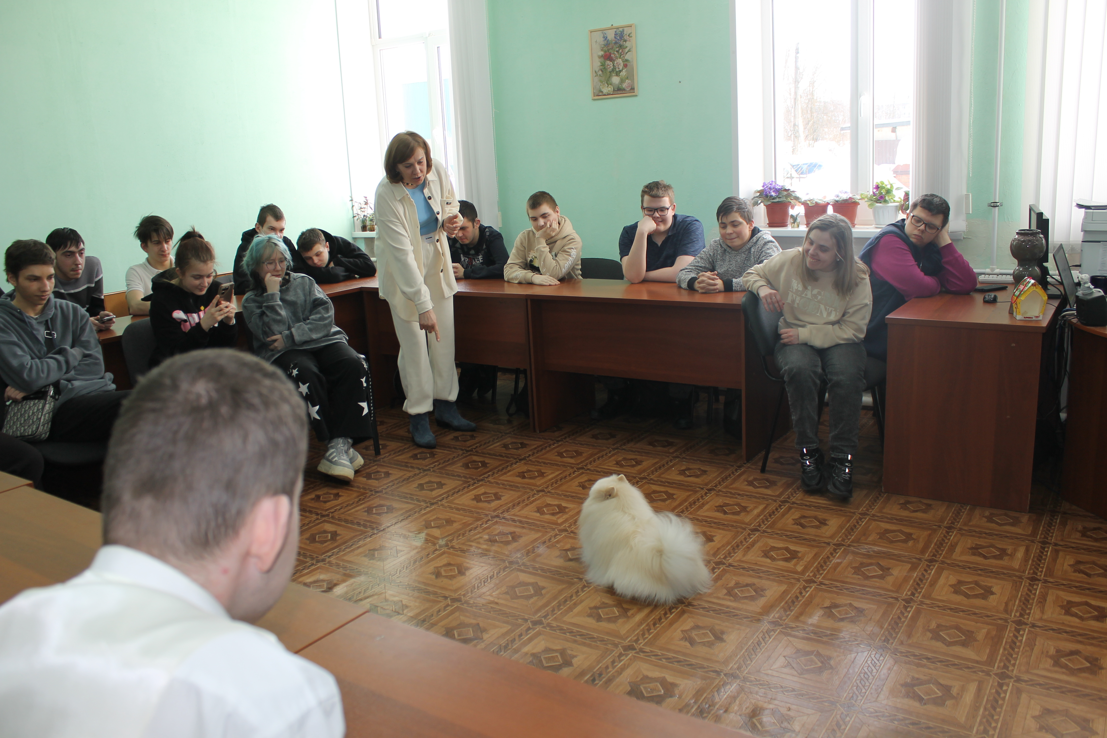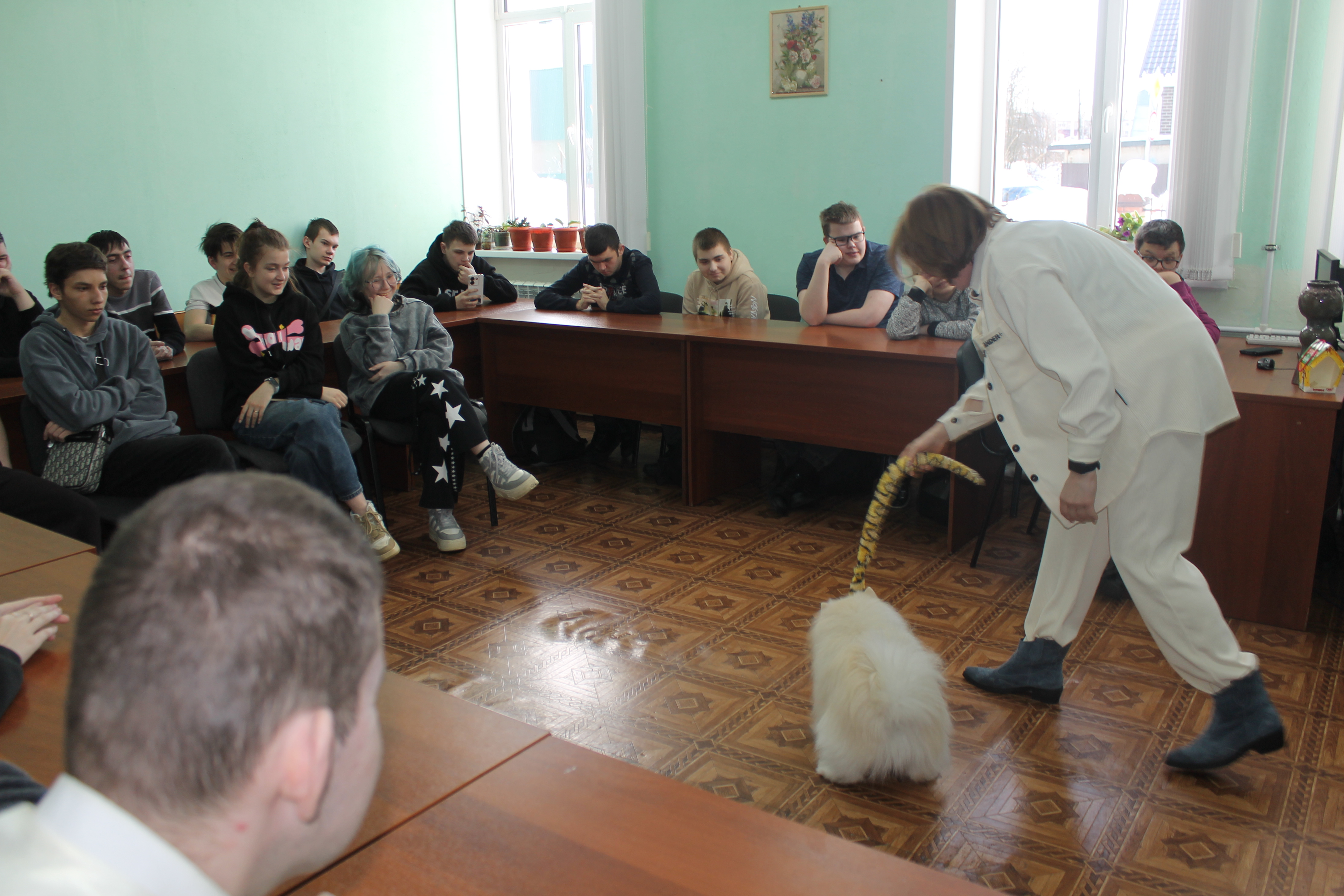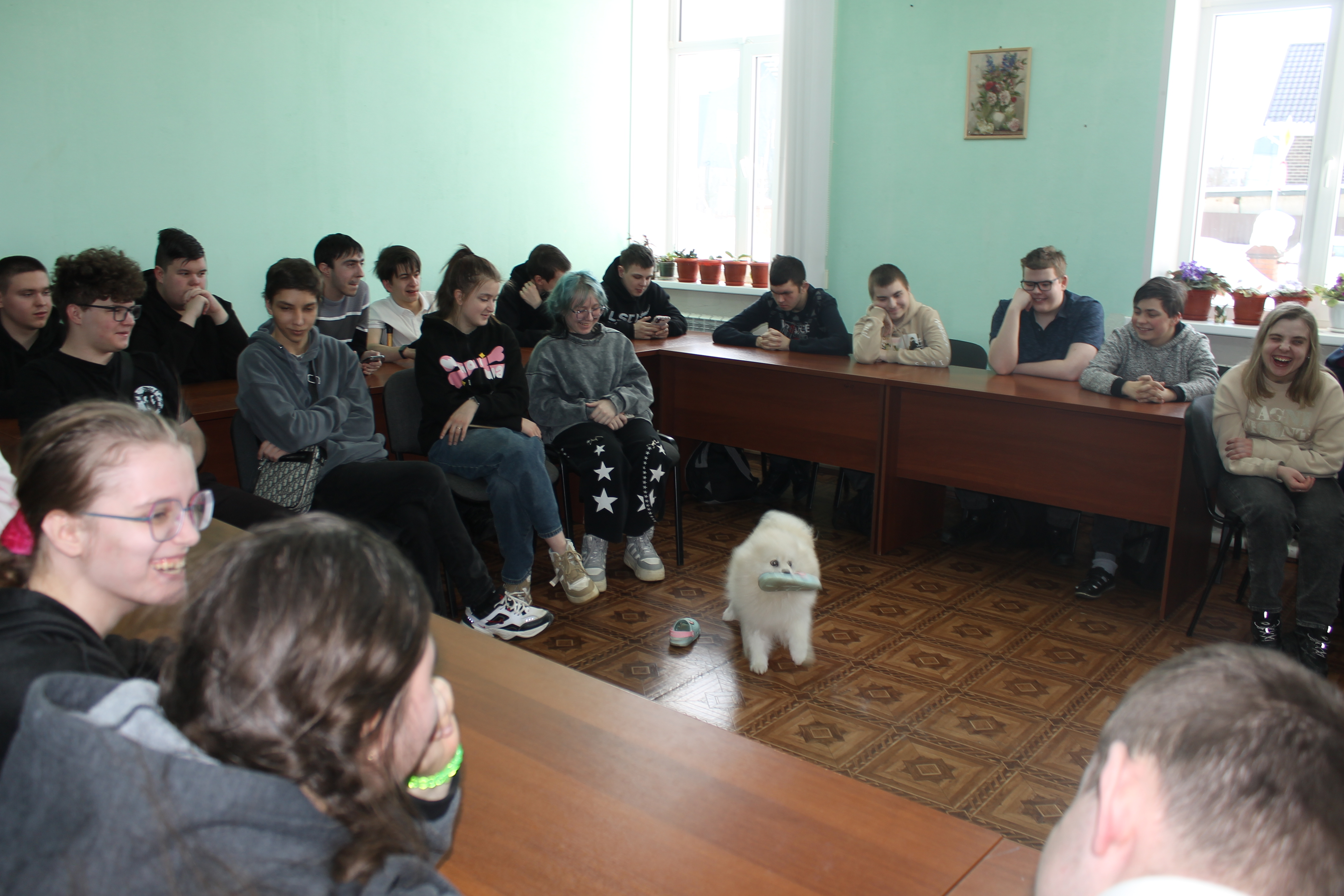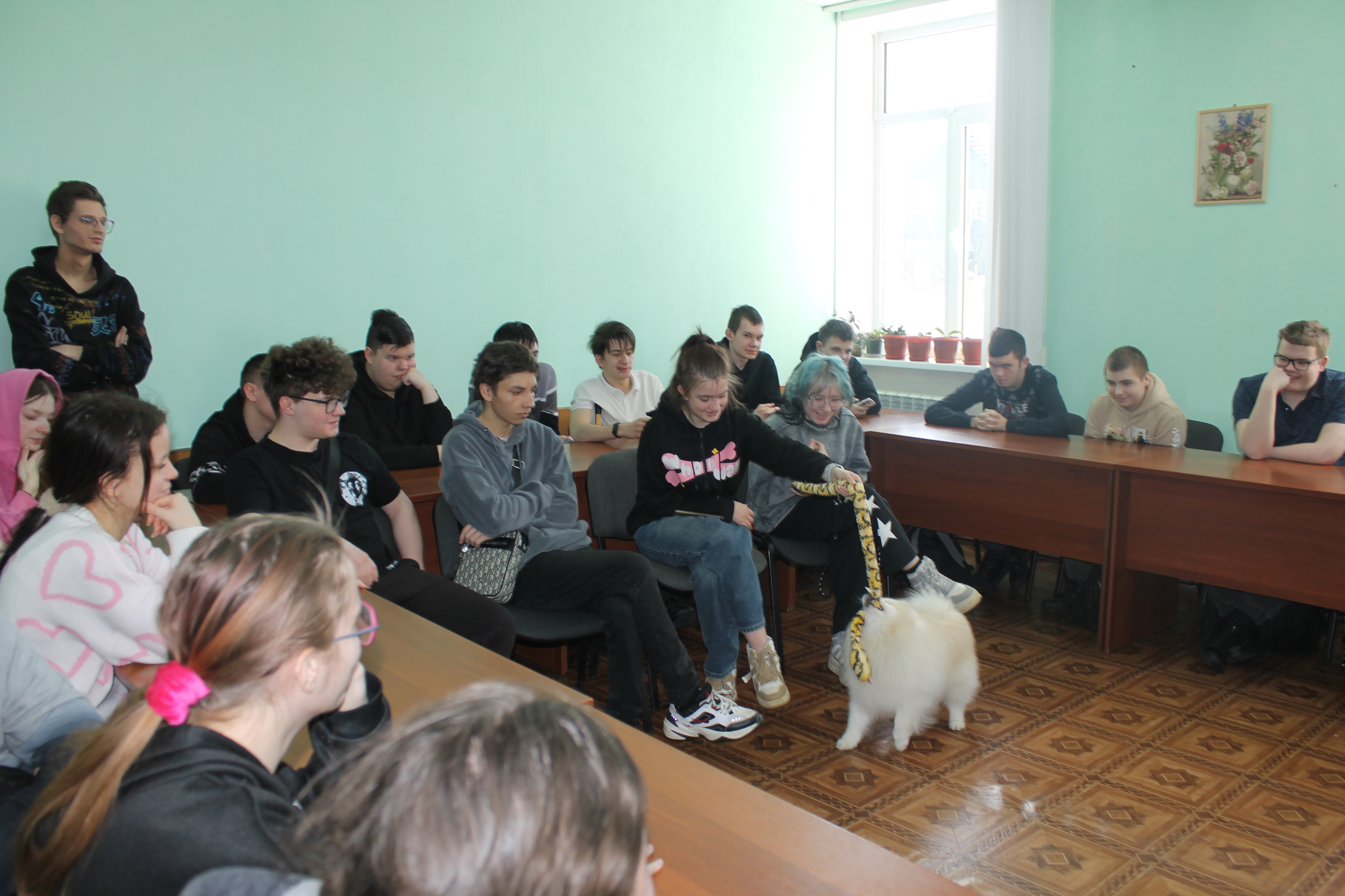 5 марта студенты учебных групп 1.88, 2.85 и 3.82 стали участниками пет-терапии. В гостях у них были кинологи: