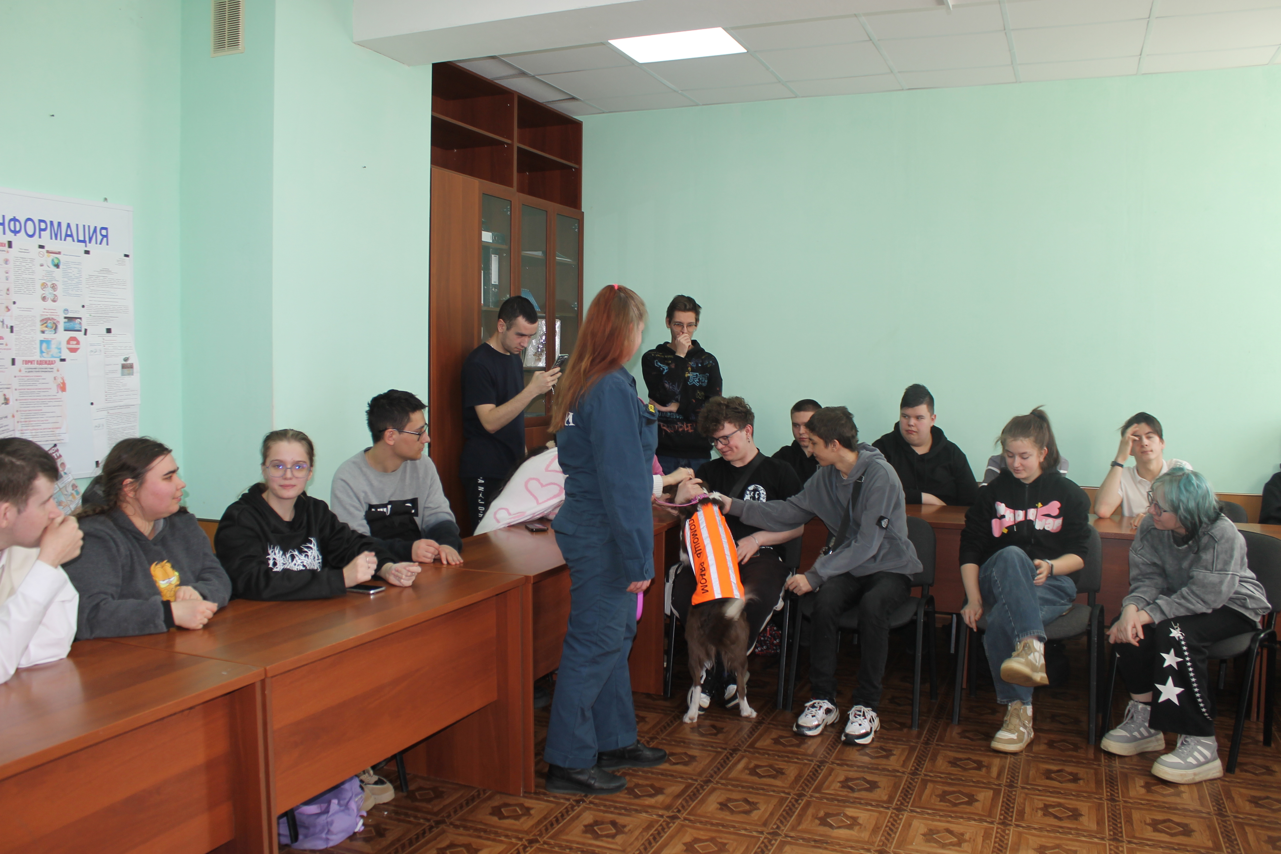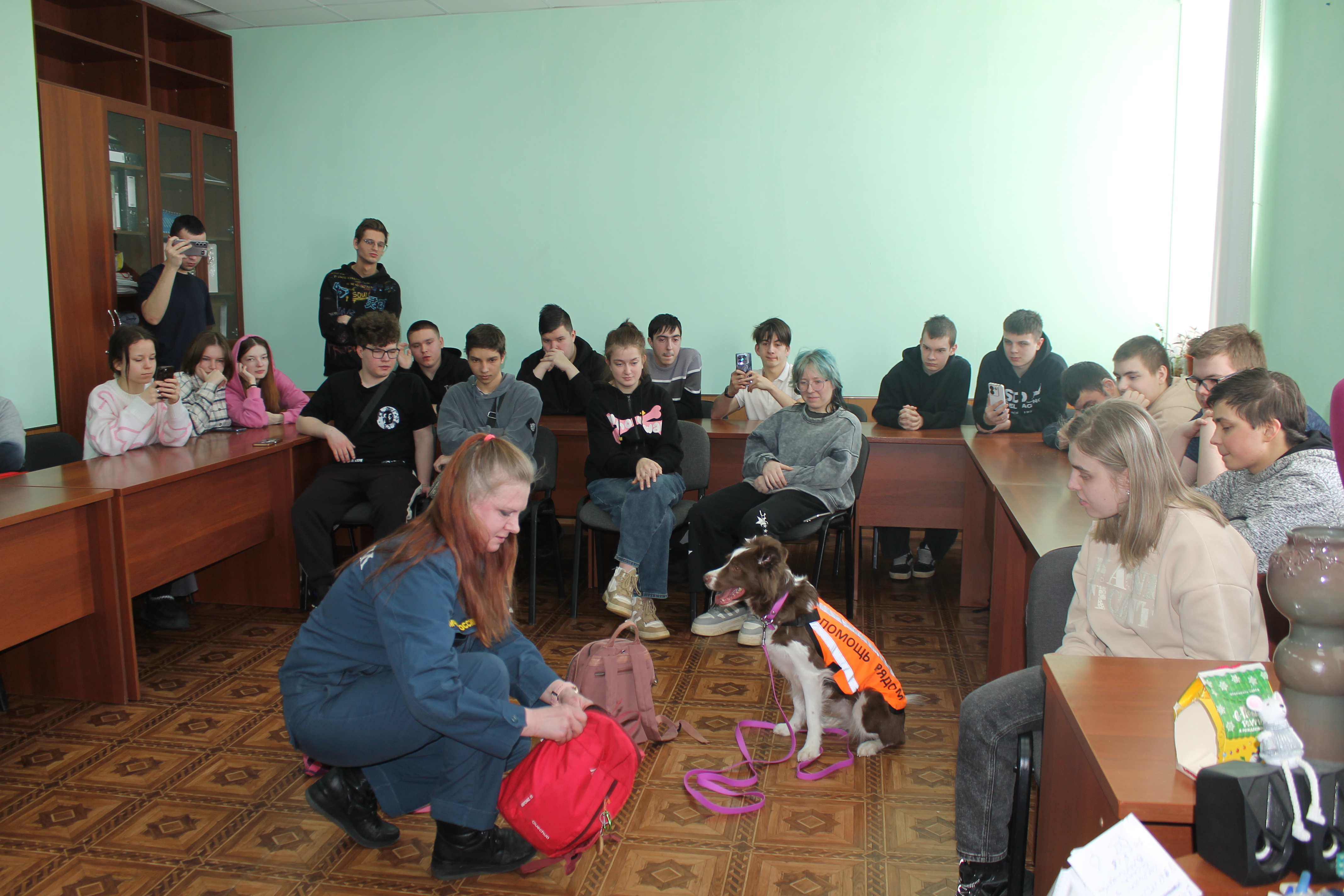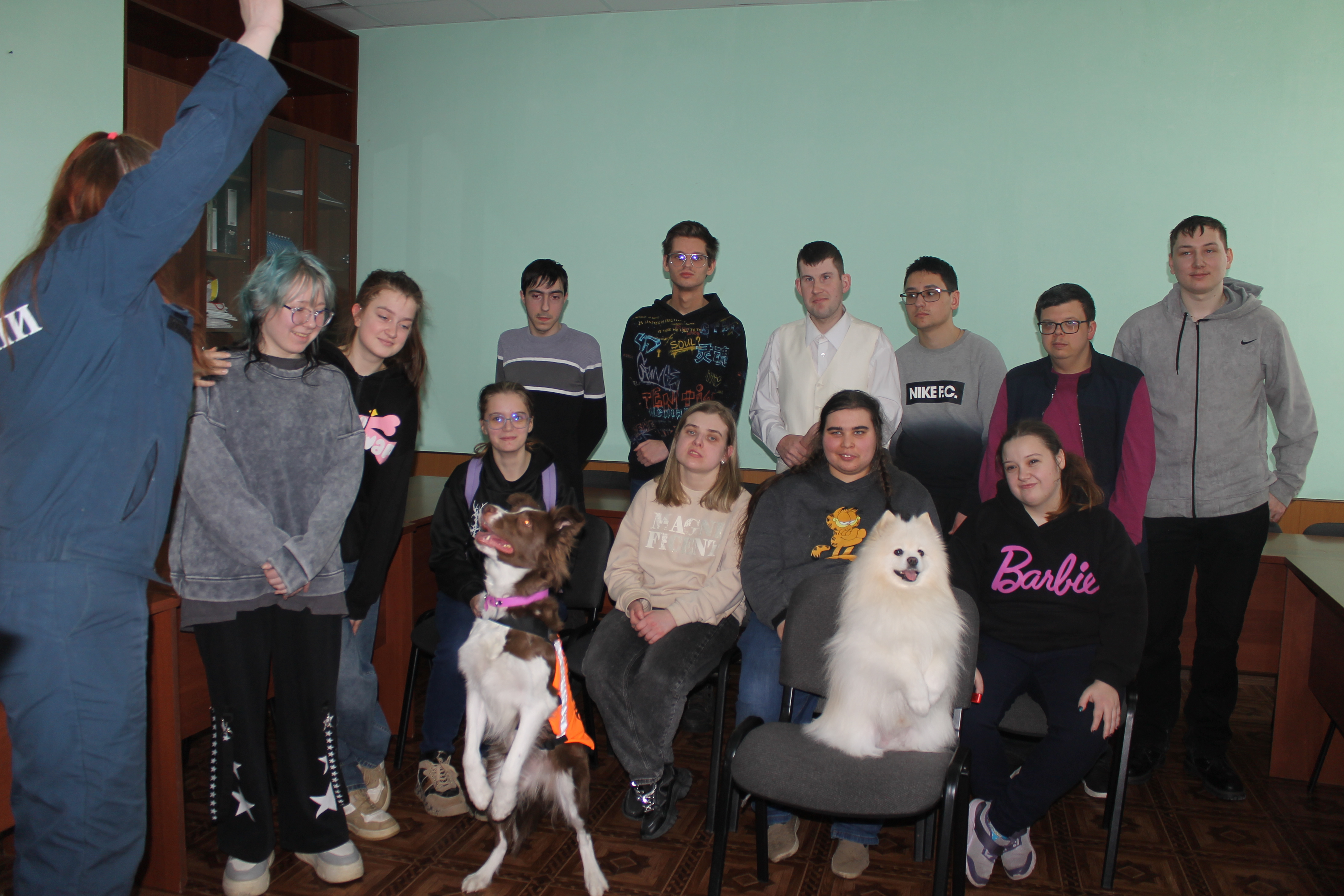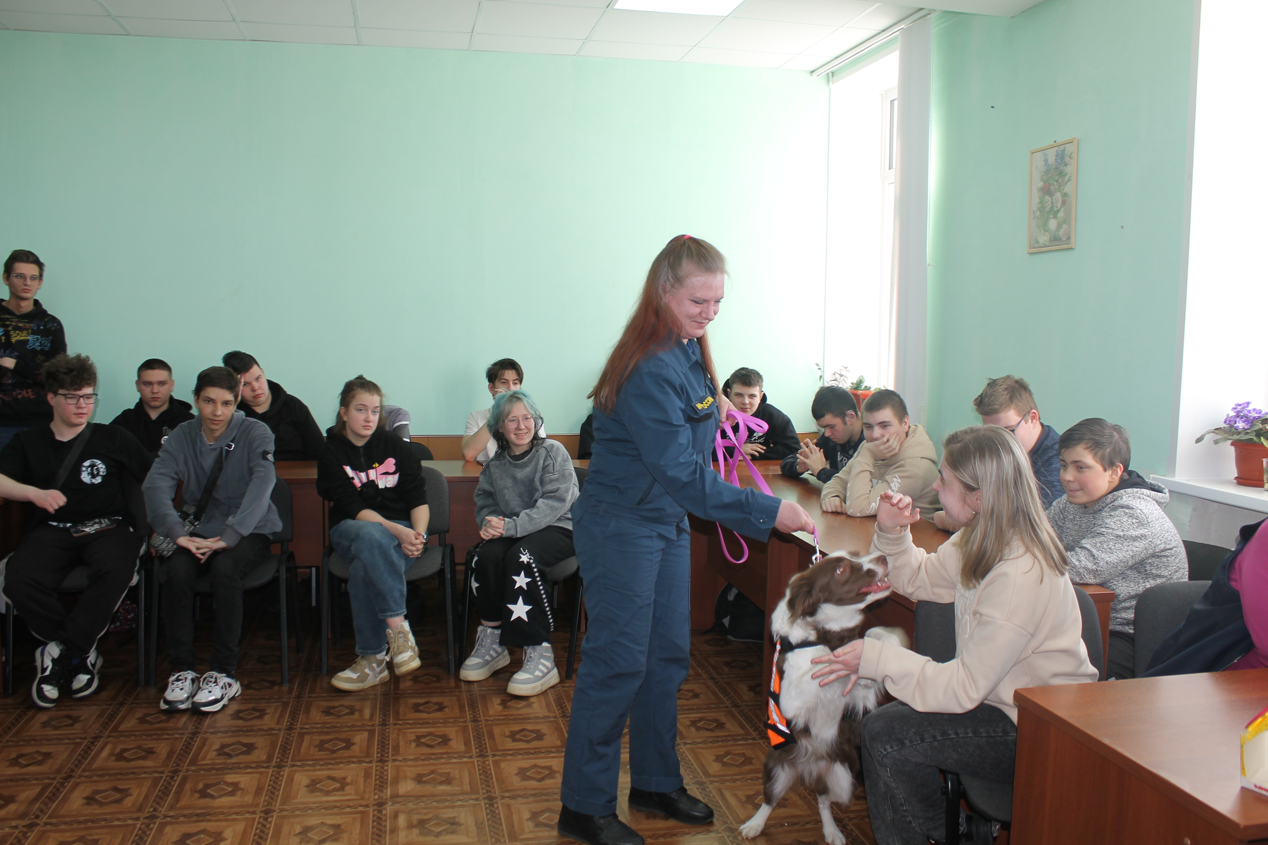 5 марта студенты учебных групп 1.88, 2.85 и 3.82 стали участниками пет-терапии. В гостях у них были кинологи: