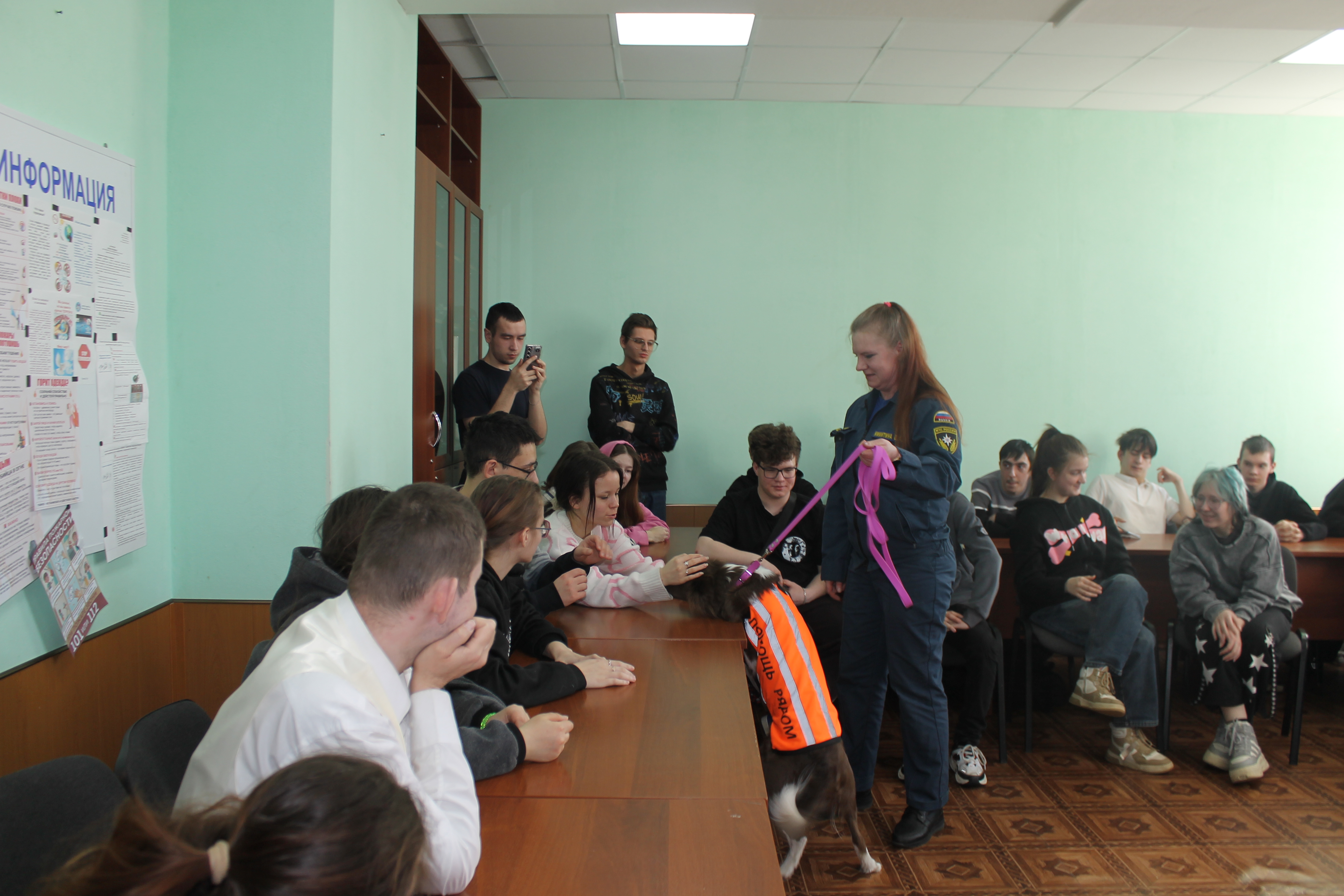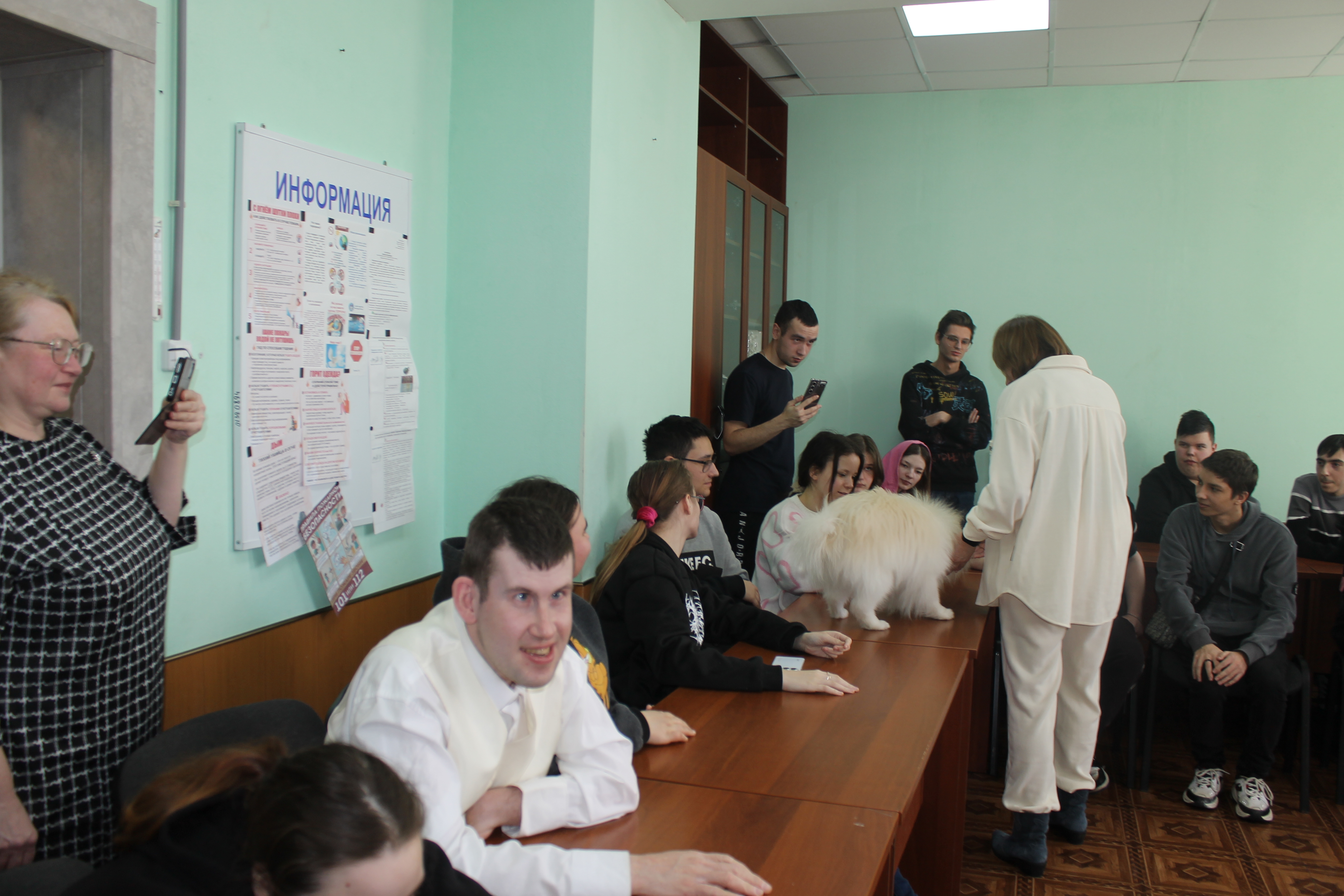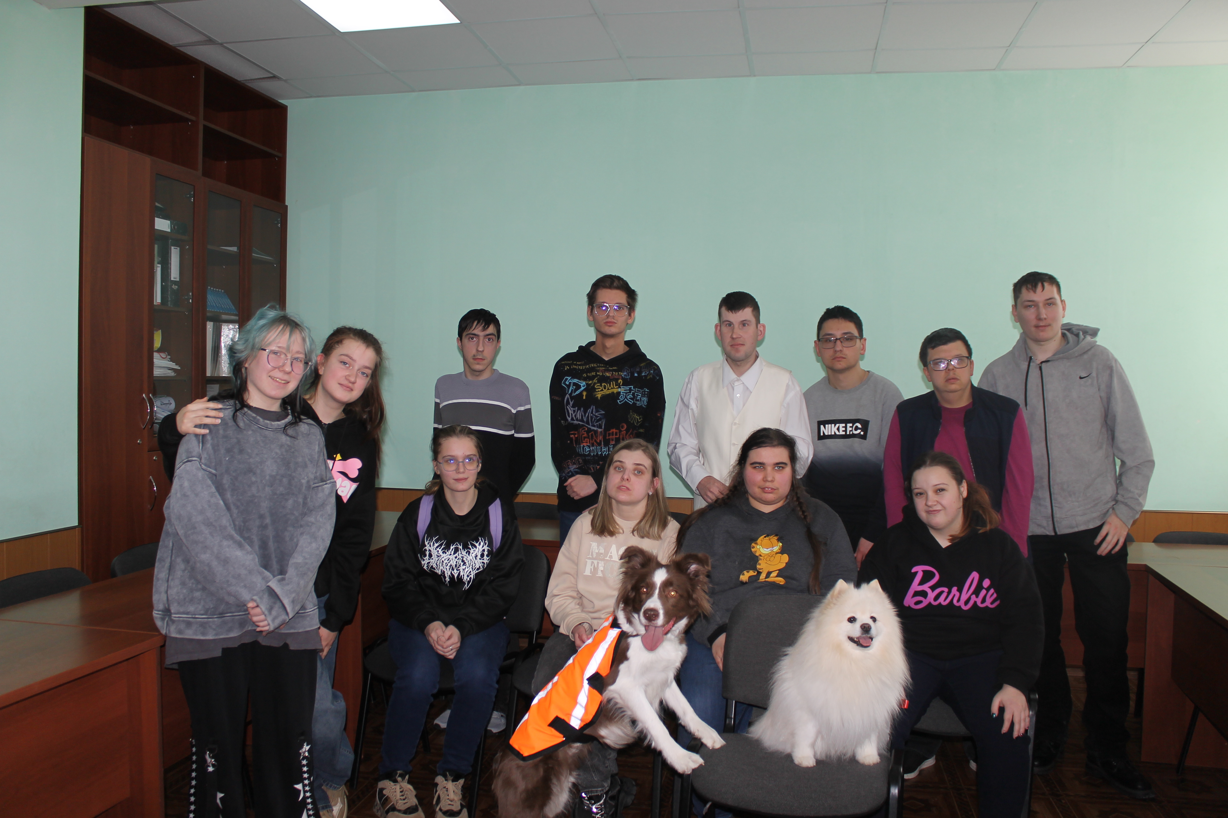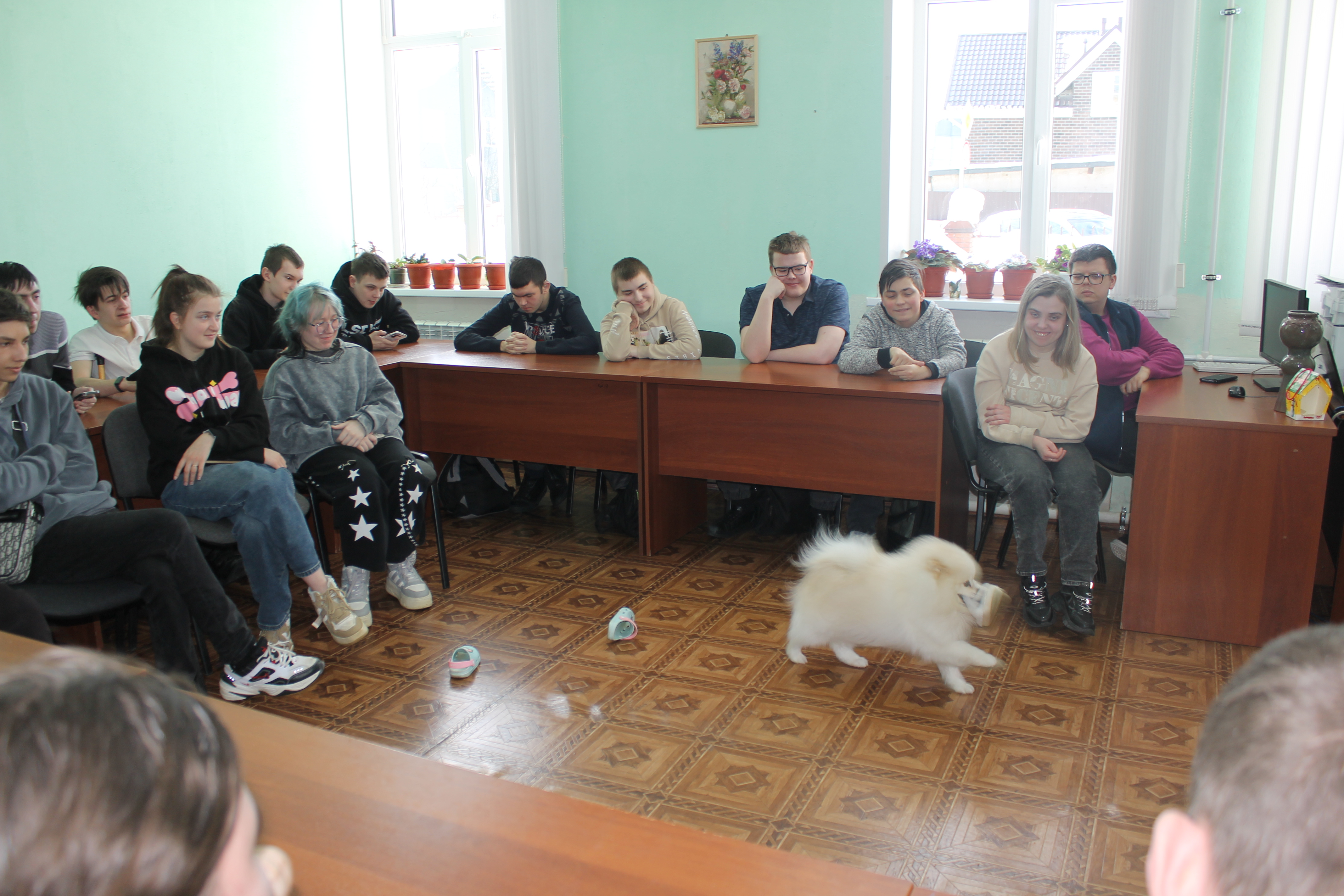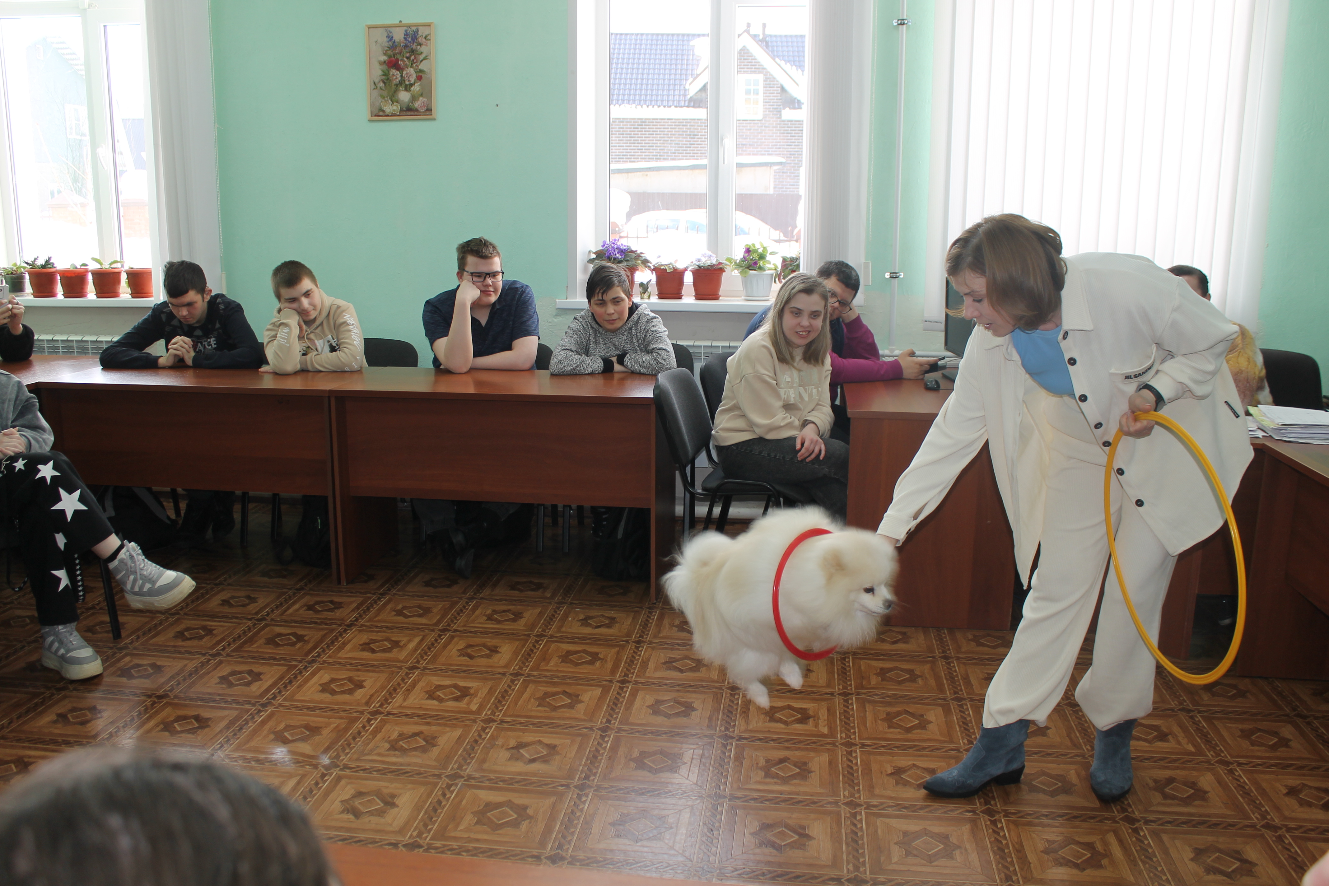 5 марта студенты учебных групп 1.88, 2.85 и 3.82 стали участниками пет-терапии. В гостях у них были кинологи: