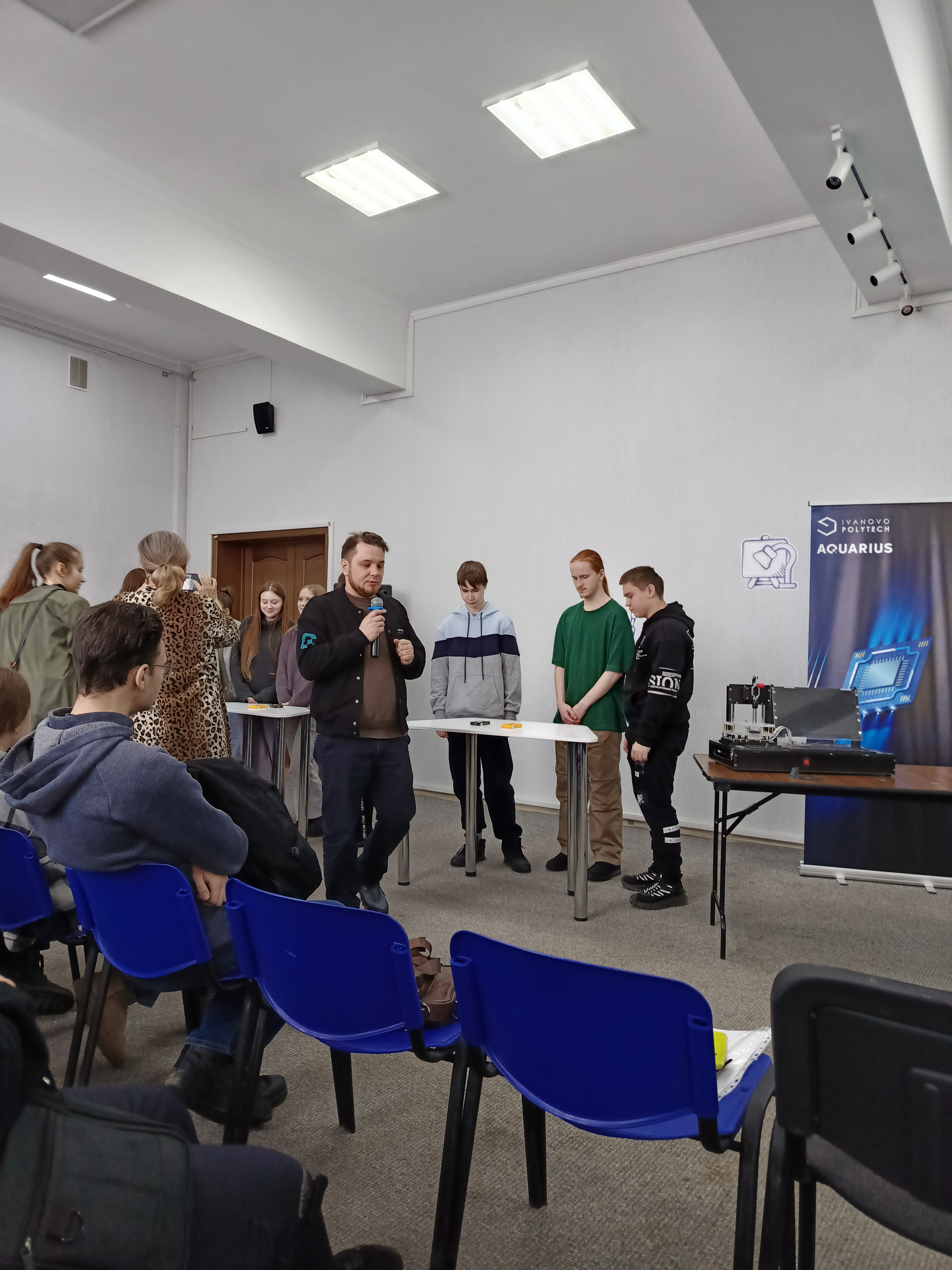 Инженер Центра подготовки персонала «Аквариуса» Даниил Нужин и специалист Центра Ольга Патрикеева провели лекцию, посвященную финальным операциям производства и функциональному тестированию компьютерной техники. Ребята с интересом посмотрели видео, смогли задать вопросы профессионалам, а затем поиграли в игру по применению элементов 5С на производстве, прошли экспресс-опрос на понимание материала и получили памятные призы от компании.