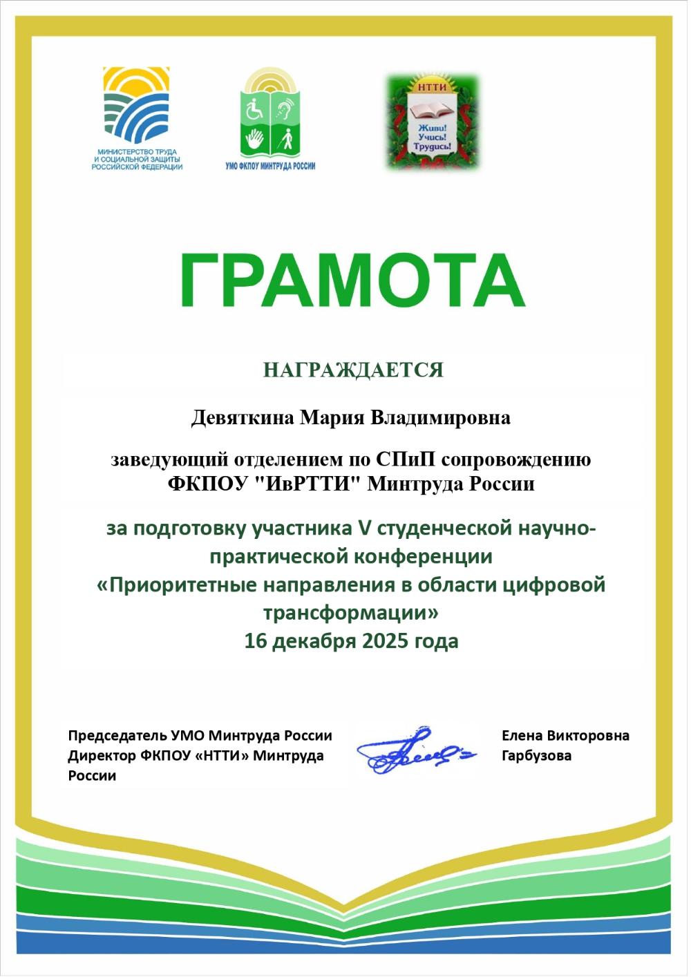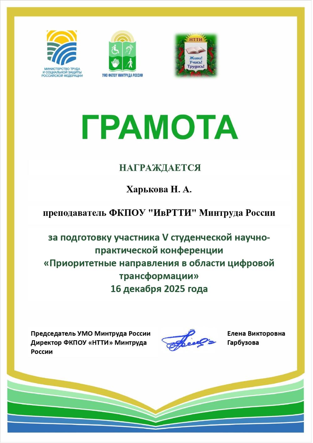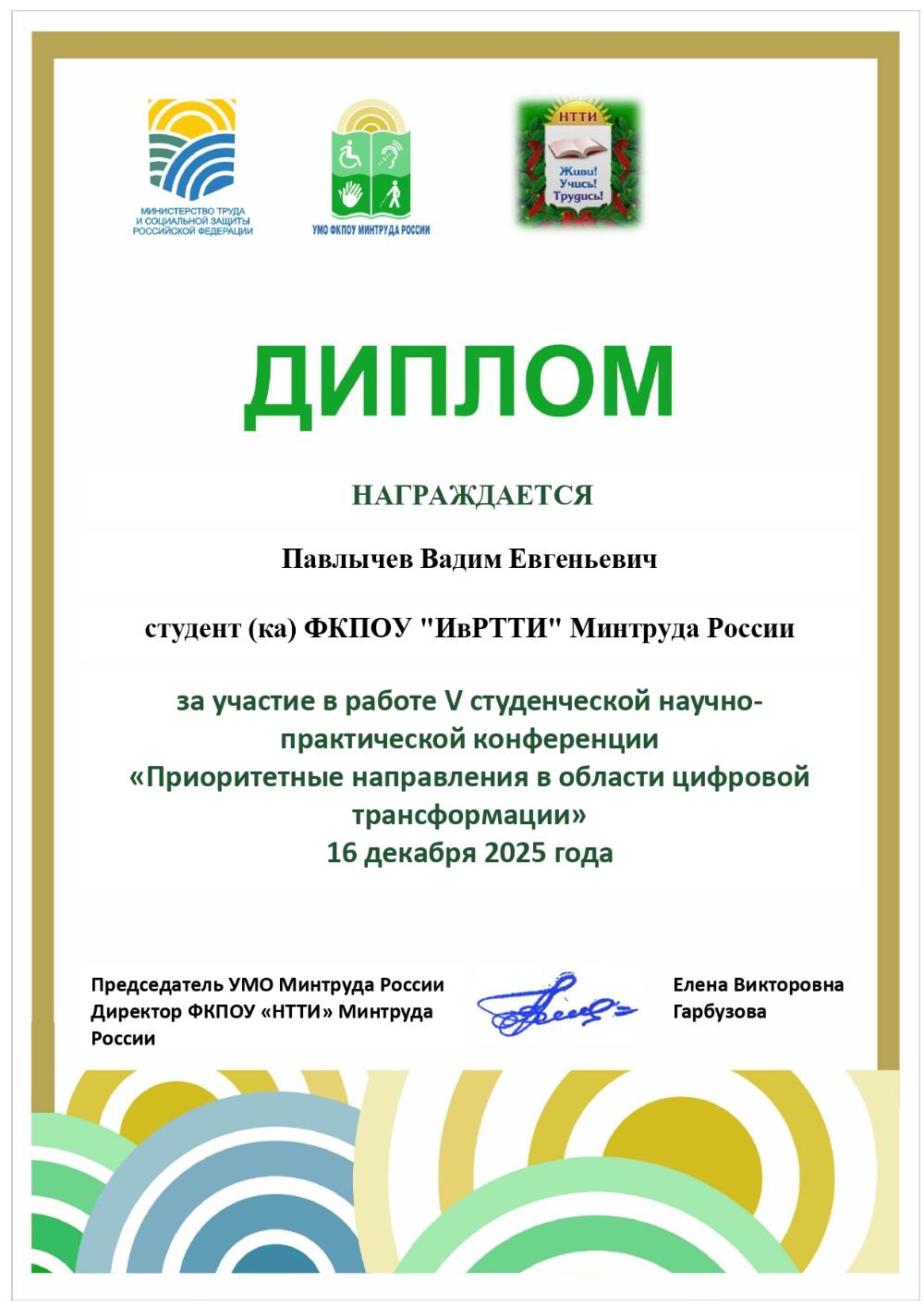Студент первого курса группы 1.88 Павлычев Вадим принял участие в V студенческой научно-практической конференции «Приоритетные направления в области цифровой трансформации», организатором которой стал Новочеркасский технологический техникум-интернат.