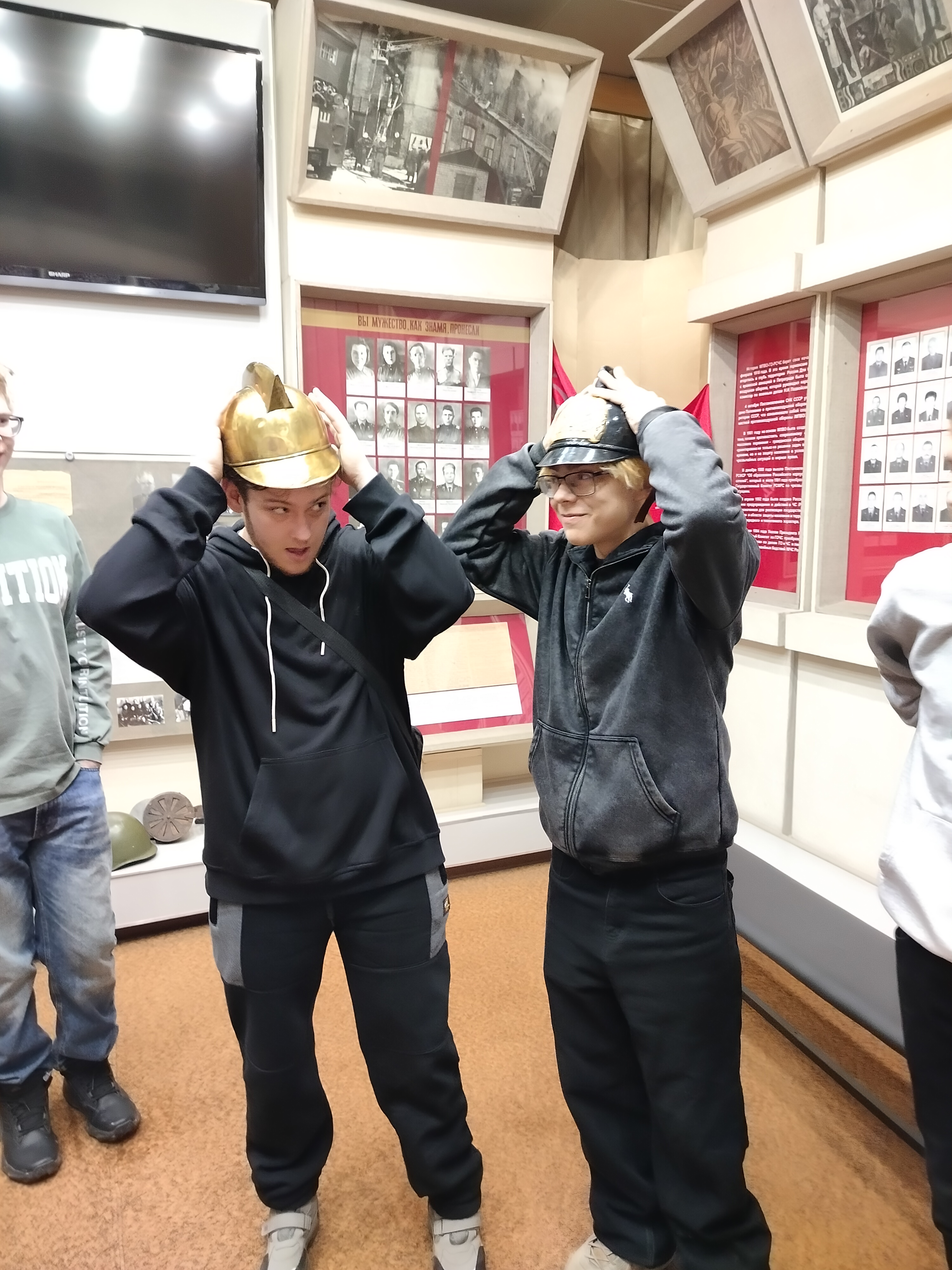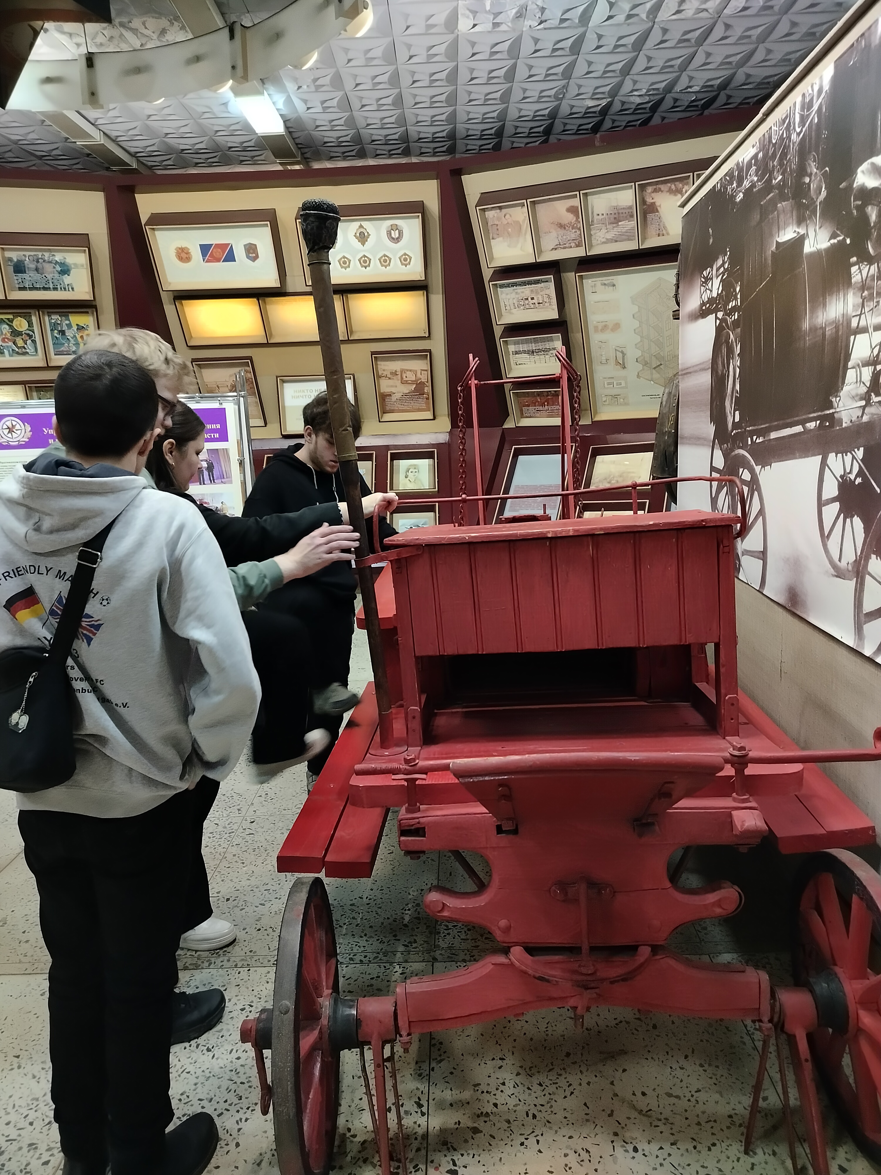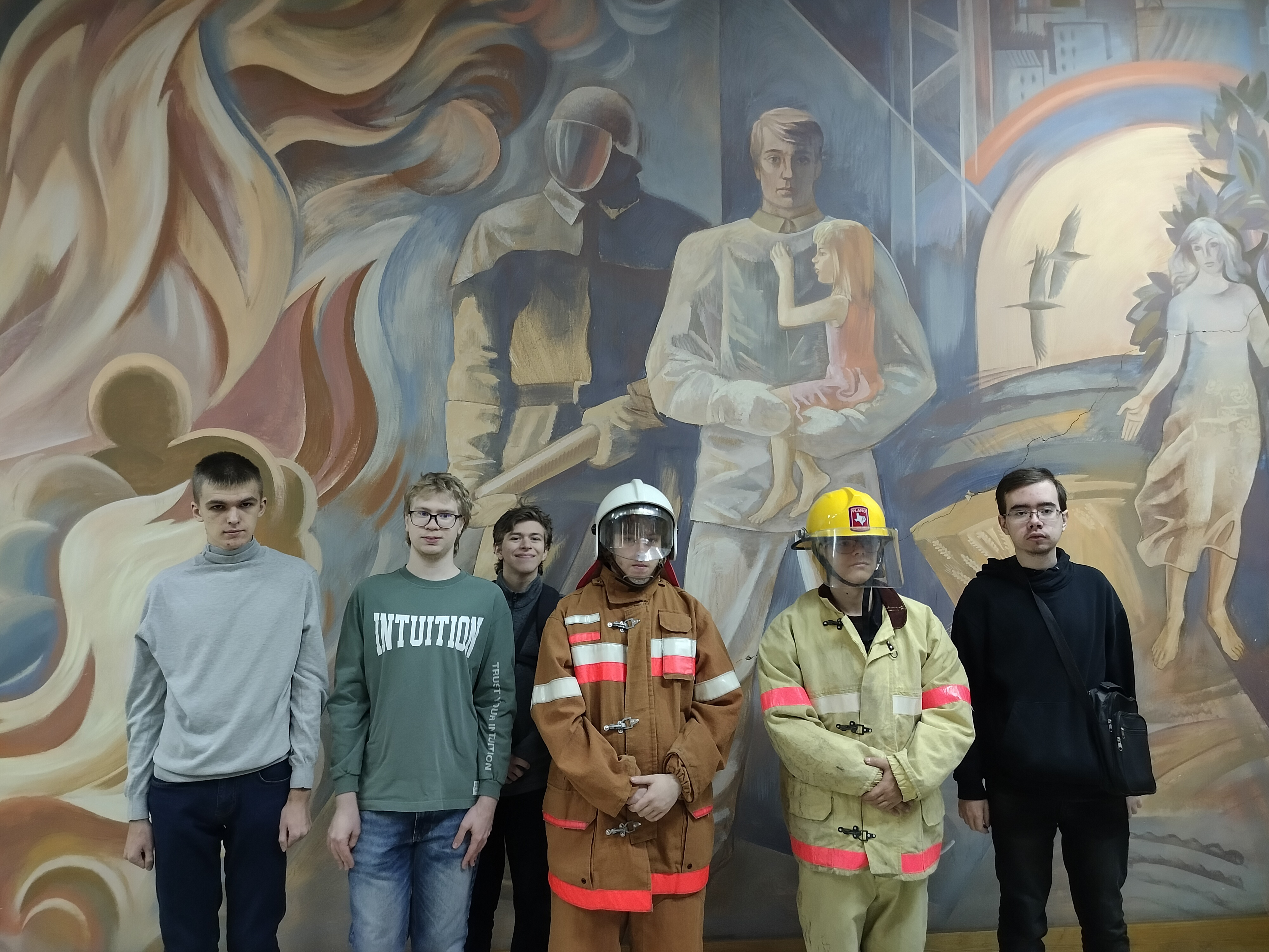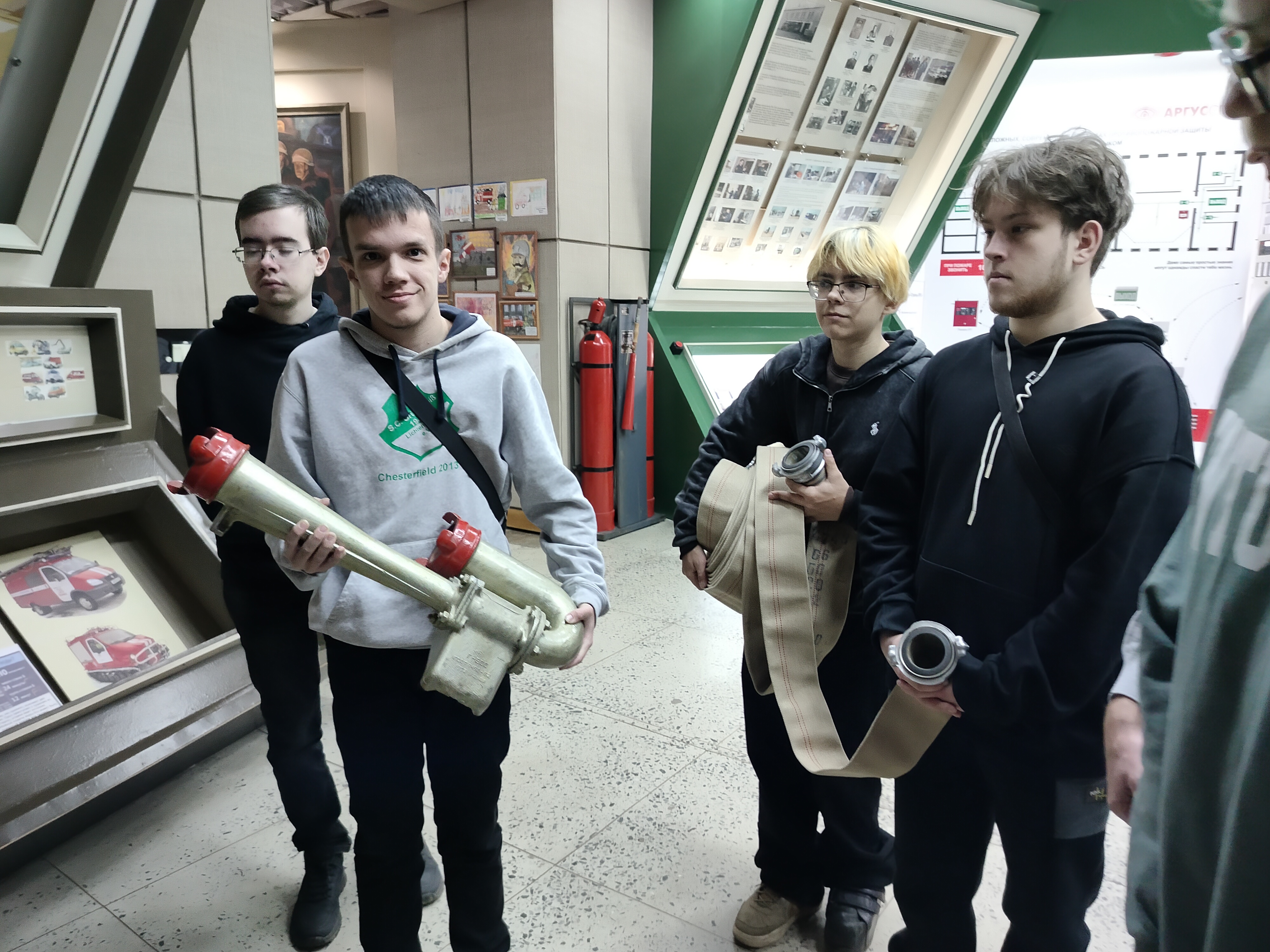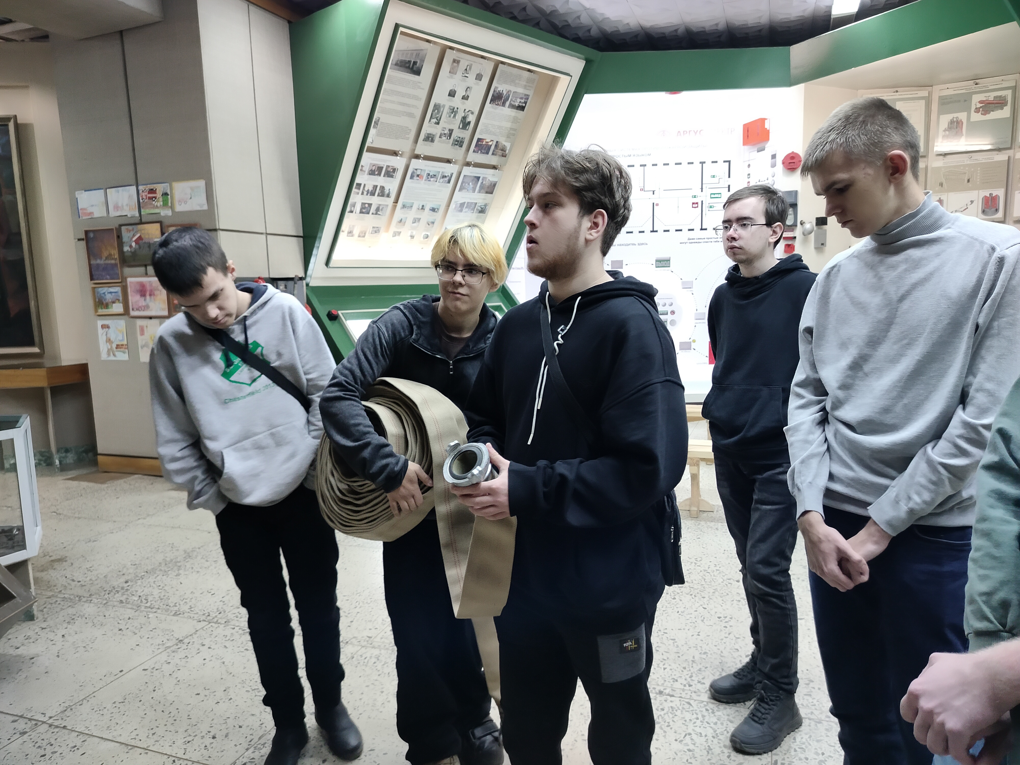 Студенты попробовали себя в роли пожарных. Они раскатывали и скручивали пожарные рукава, примеряли рабочий комплект пожарного. В заключение встречи приняли участие в интерактивной игре "Правда - неправда", узнали интересные факты из истории России и Европы, связанные с пожарным делом, а также обсудили учебно- познавательный видеоматериал о пожарной безопасности.