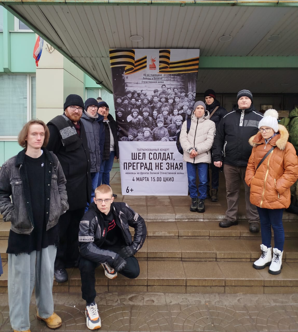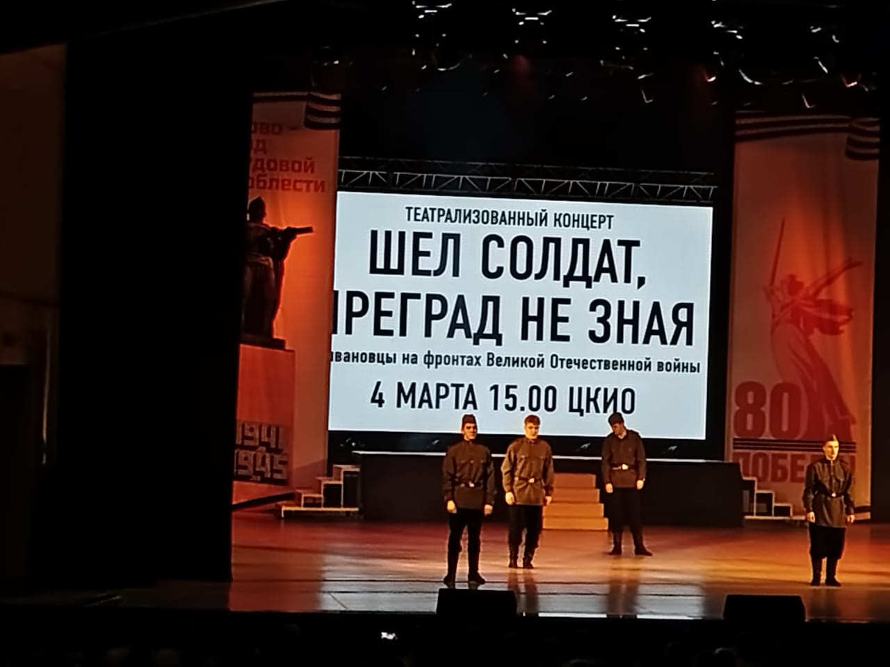 В рамках комплексного плана 80-летия Победы в Великой Отечественной войне на площадке МБУ «Центр культуры и отдыха города Иваново» 4 марта состоялся театрализованный концерт «Шел солдат, преград не зная», в честь памяти земляков, отстоявших свободу и независимость на фронтах Великой Отечественной войны.