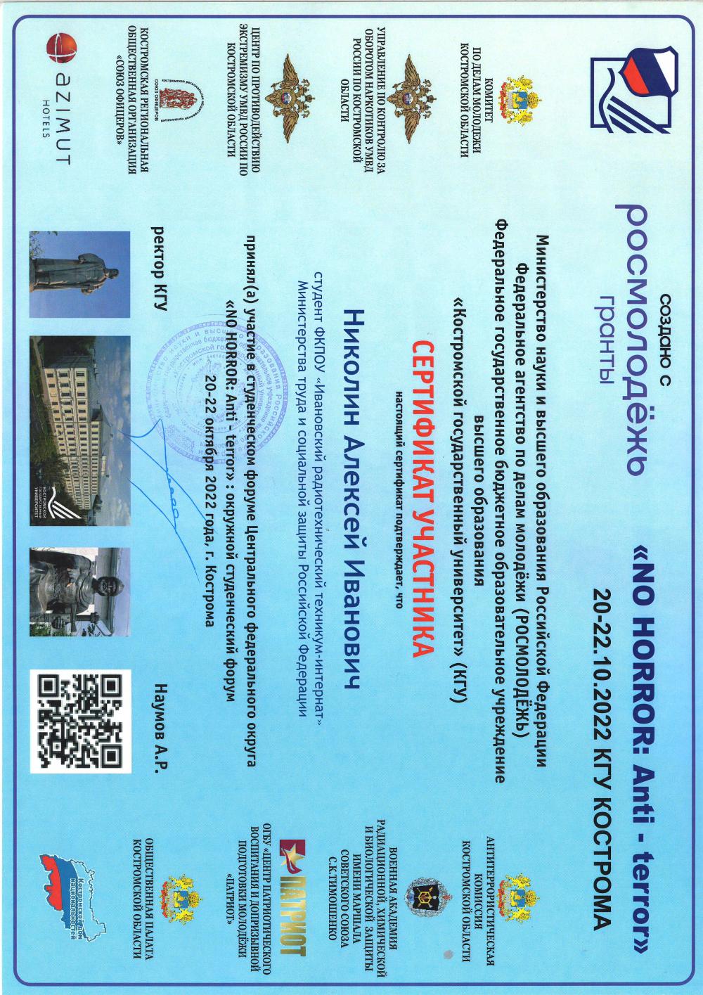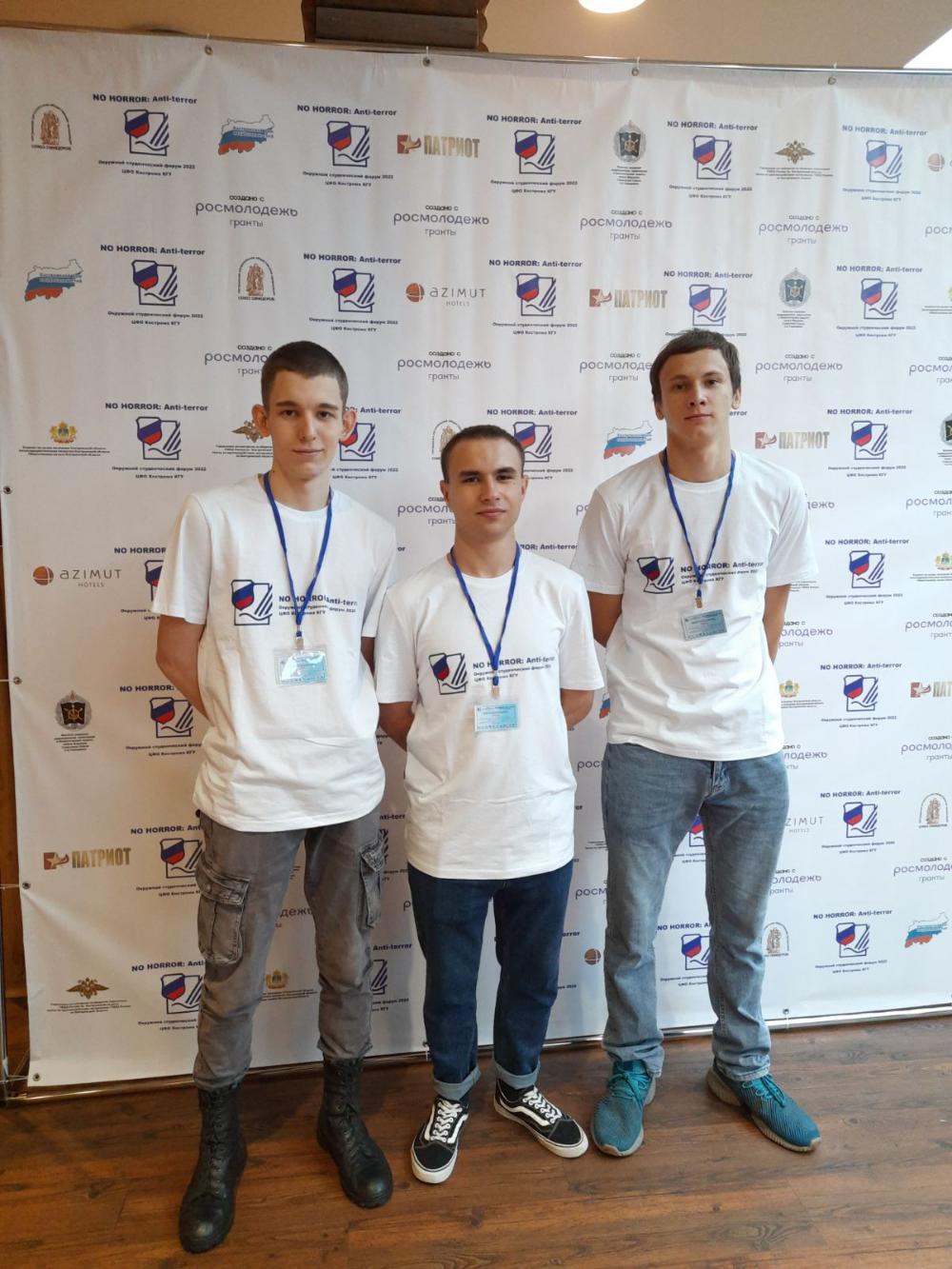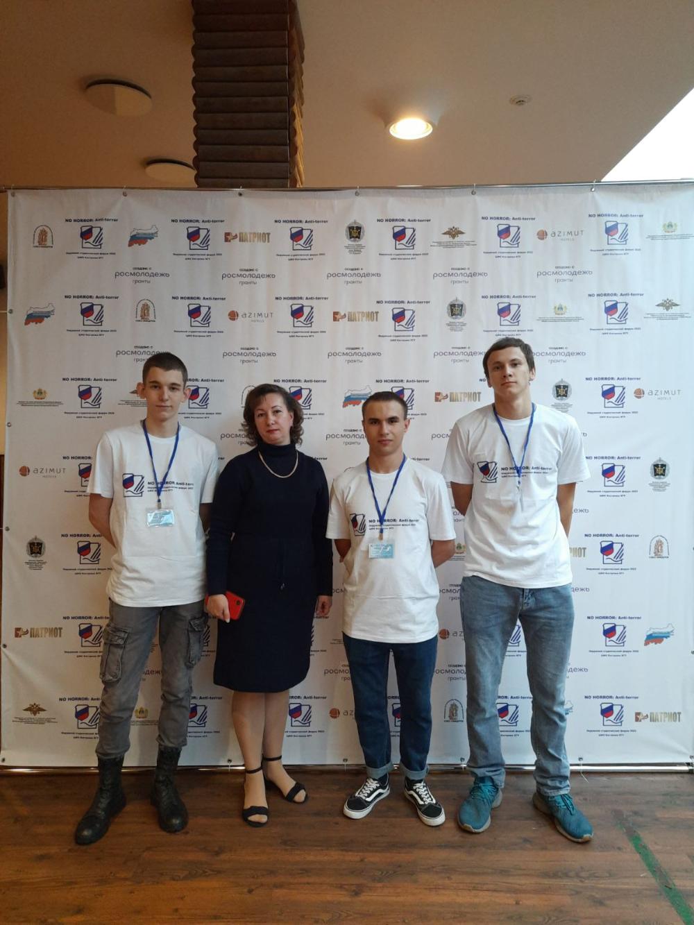 20-22.10.2022 социальный педагог Абдуллоева Анна Ивановна и обучающиеся 3 курса Веденов Сергей, Голованов Владимир, Николин Алексей приняли участие в студенческом форуме Центрального федерального округа «NO HORROR: Anti-terror». Организаторами Форума выступали ФГБОУ ВО «Костромской государственный университет», при грантовой поддержке Федерального агентства по делам молодёжи.