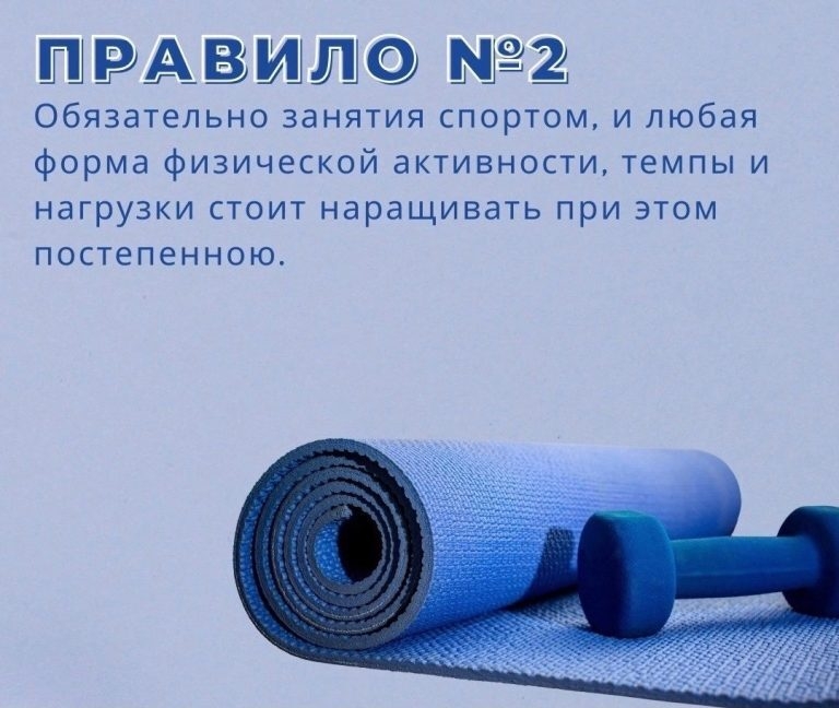Регулярно занимайтесь физкультурой и спортом. Физическая активность помогает вам поддерживать здоровый вес, снижает риск сердечно-сосудистых заболеваний, инсульта, диабета и рака, а также помогает бороться с депрессией. Взрослый человек должен заниматься физической активностью средней интенсивности не менее 30 минут ежедневно.
