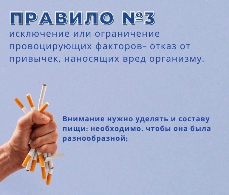Откажитесь от курения. Оно влияет в будущем на развитие онкологических, бронхолегочных, сердечно-сосудистых заболеваний, вызывает импотенцию.