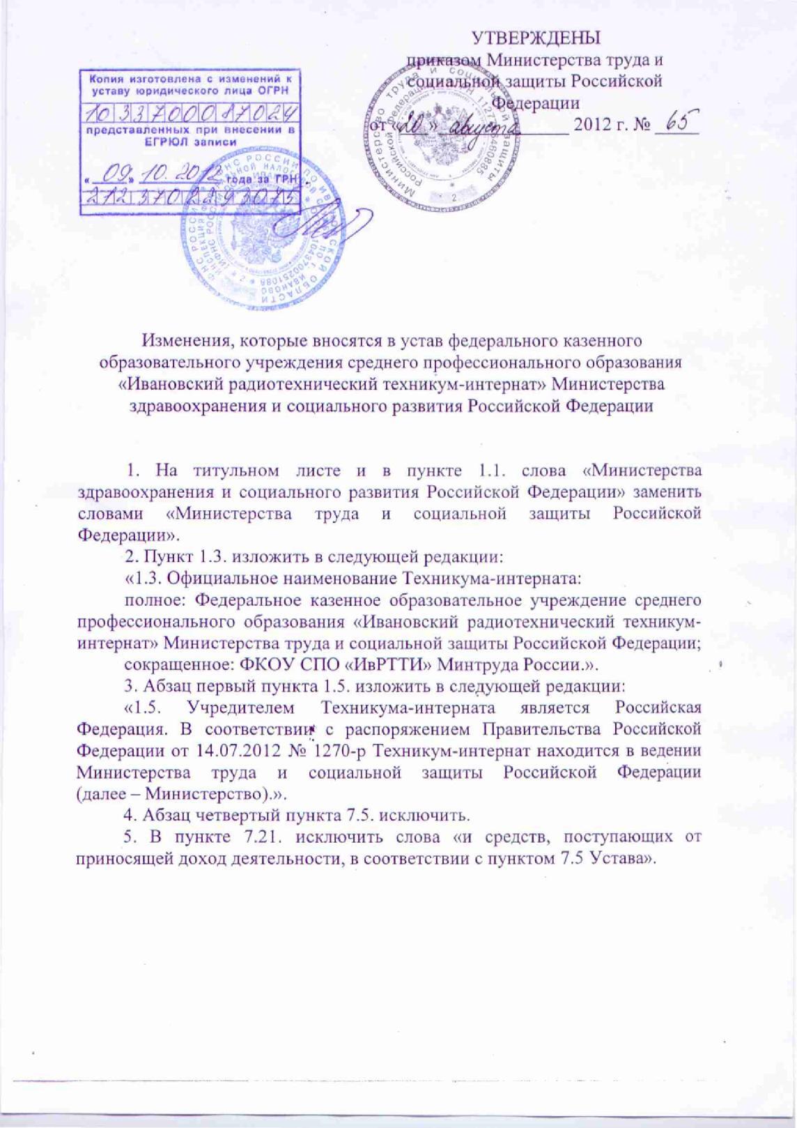 - Изменения в устав ФКПОУ ИвРТТИ