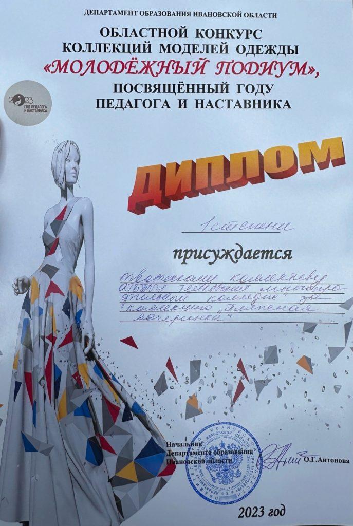 Так же одним из показателей профмастерства является участие в областном конкурсе коллекций моделей одежды «Молодёжный подиум-2023», который прошел на базе областного государственного бюджетного профессионального образовательного учреждения «Родниковский политехнический колледж». Коллекция моделей одежды, изготовленная нашими студентами, под руководством опытных мастеров производственного обучения, заняла почетное первое место.