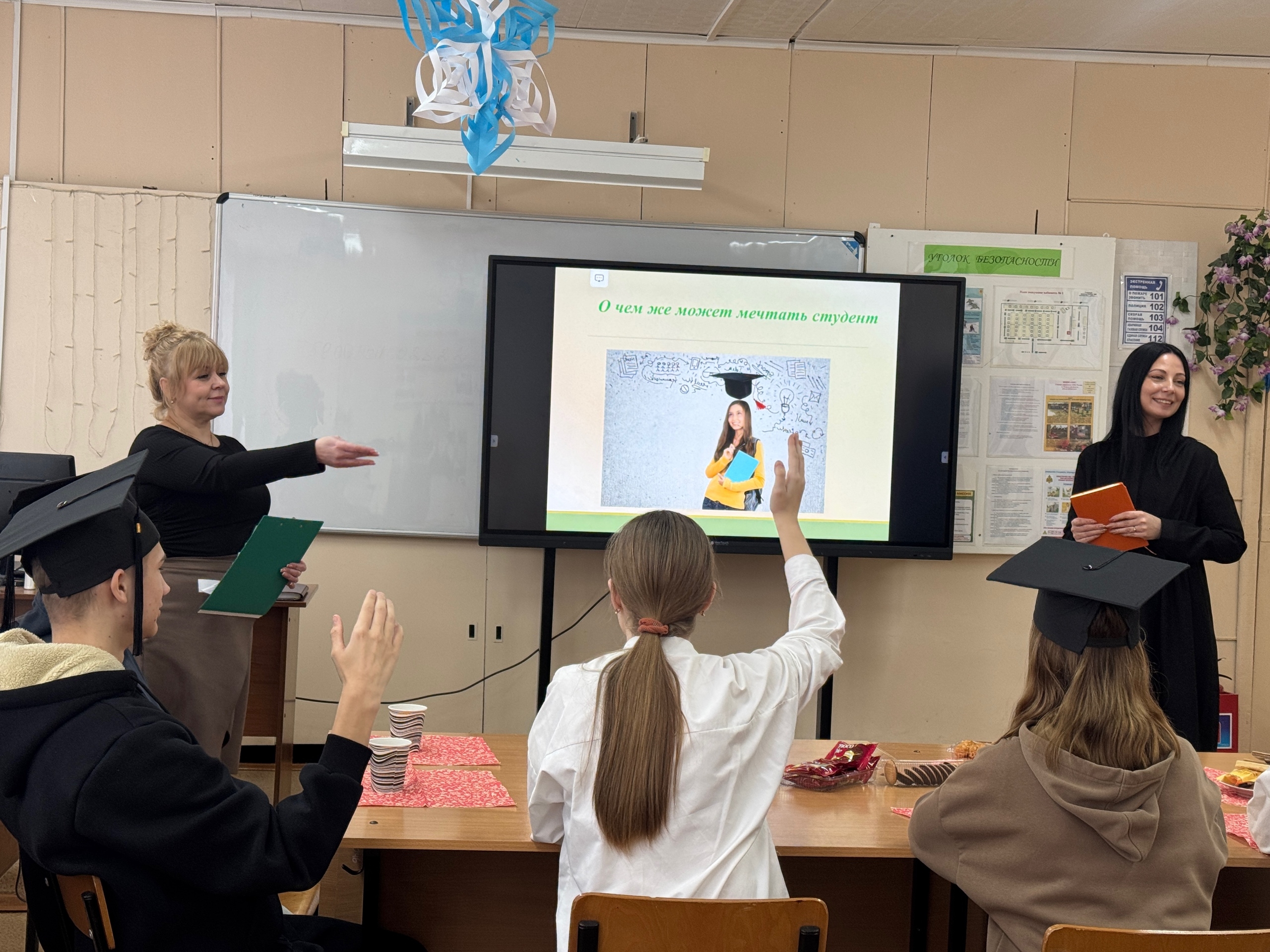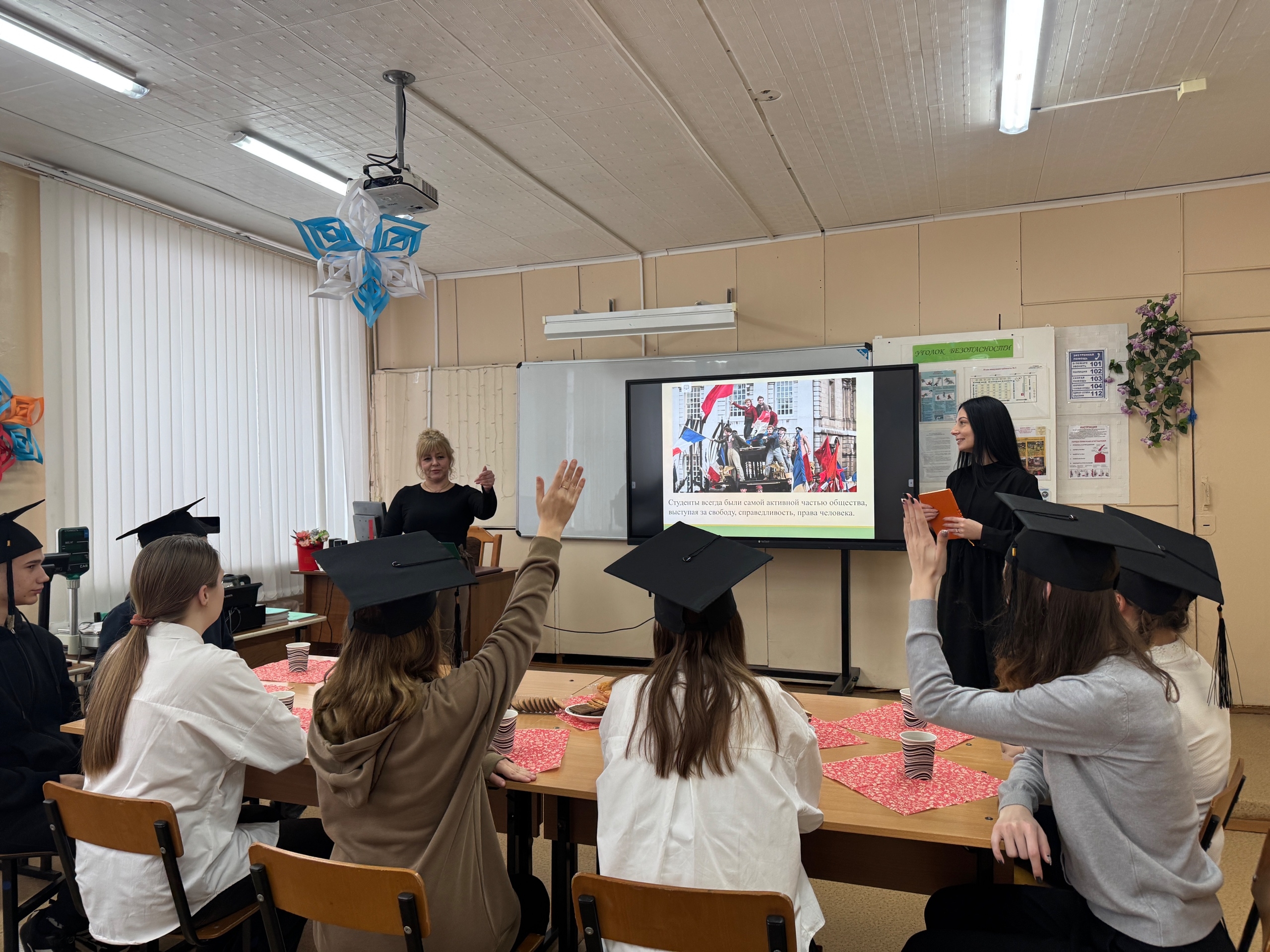 Преподаватель специальных дисциплин Венедиктова О.В. вместе с советником директора по воспитанию Спицыной Е.А. напомнили собравшимся историю становления традиций празднования Дня студентов.